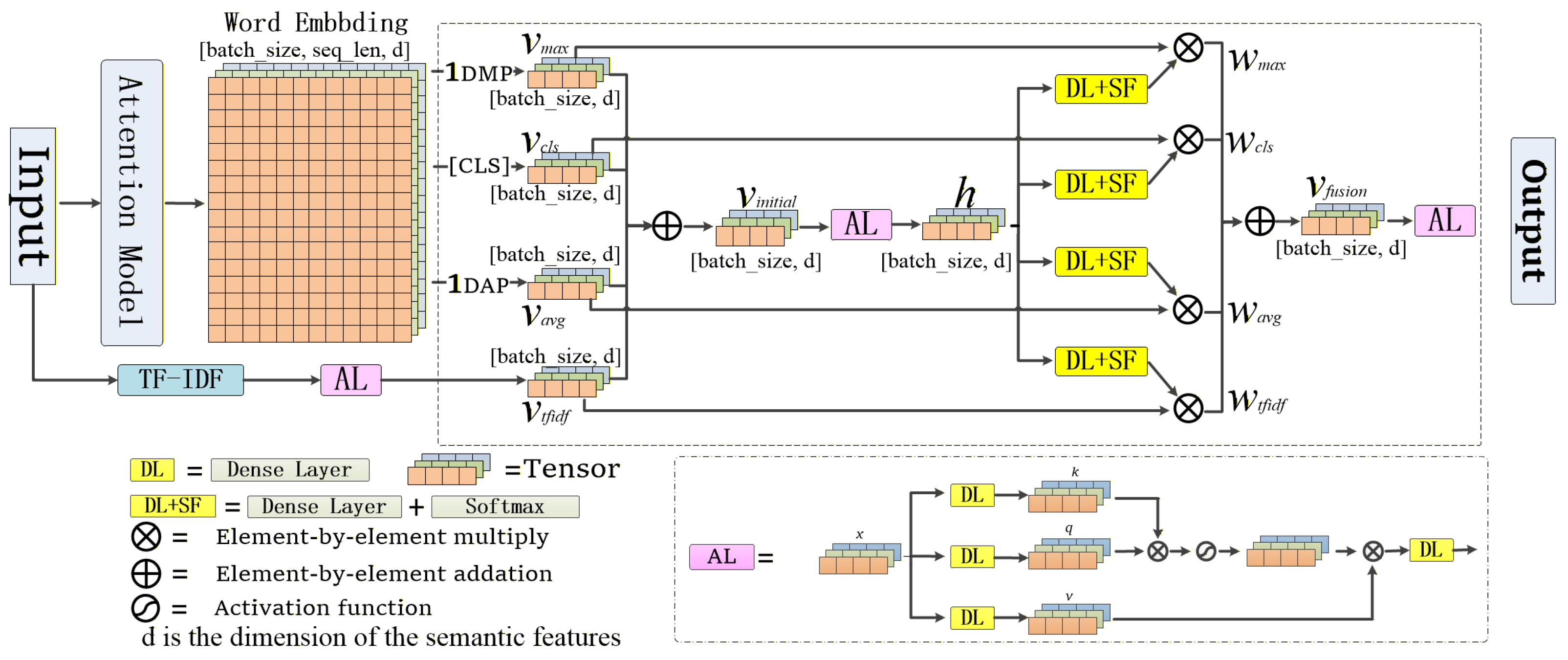 5] vector for classification, but this study introduces a multi-feature fusion layer that integrates local features, global features, and Term Frequency–Inverse Document Frequency (TF-IDF) features. This enables the model to fully utilize the semantic information in the text, thereby further improving classification accuracy.