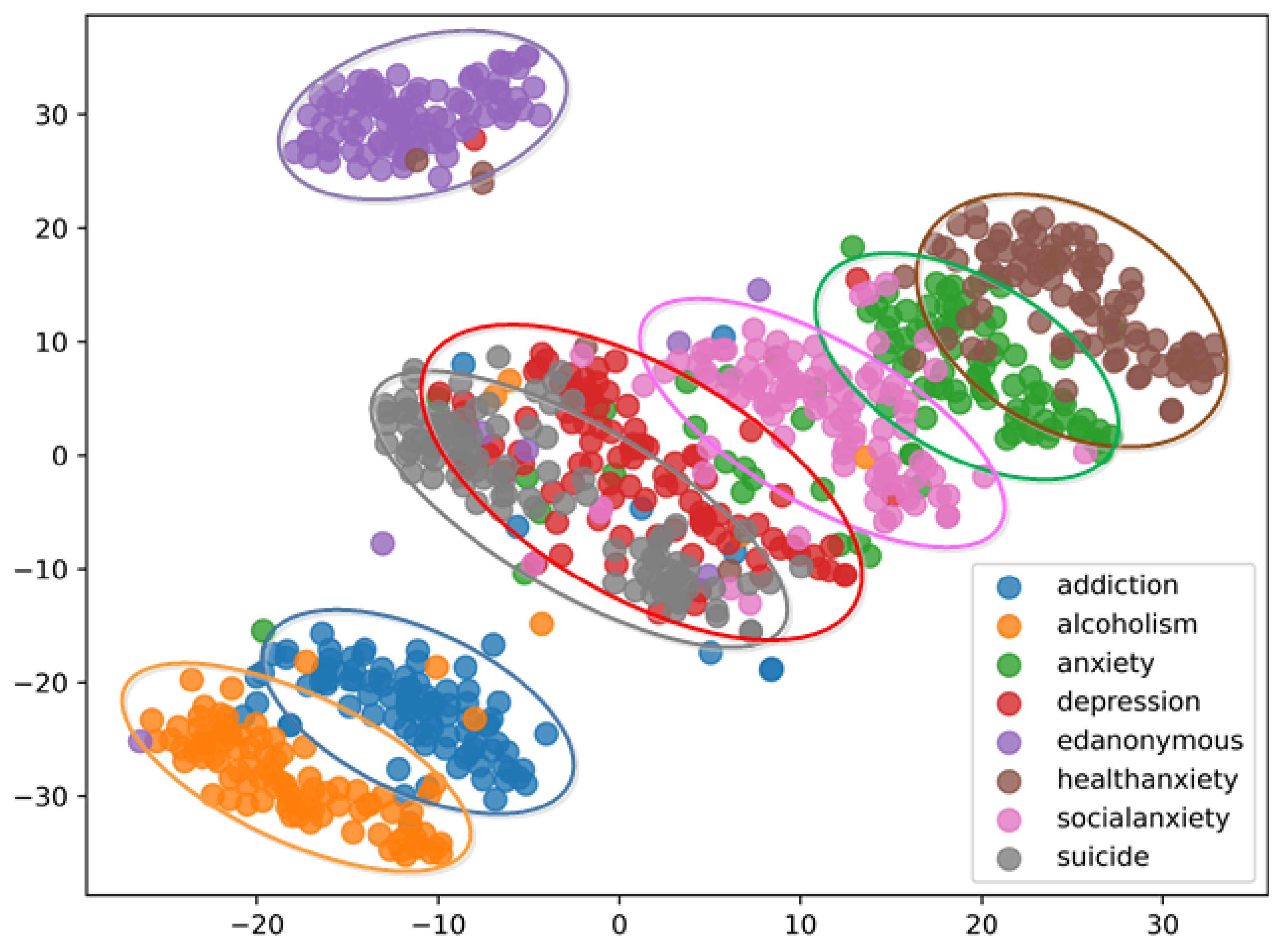 Figure 4 shows that the data points of the anonymous category formed an isolated cluster, indicating clear distinction from other categories. Analysis of other categories showed a strong correlation between addiction and alcoholism, with weaker associations to other categories. In contrast, the suicide and depression categories exhibited considerable overlap, underscoring a strong correlation. While social anxiety and health anxiety showed relative independence, they were still related to general anxiety. These insights align with previous discussions on category correlation. Furthermore, results from the confusion matrix in subsequent experiments were consistent with the category correlation shown in