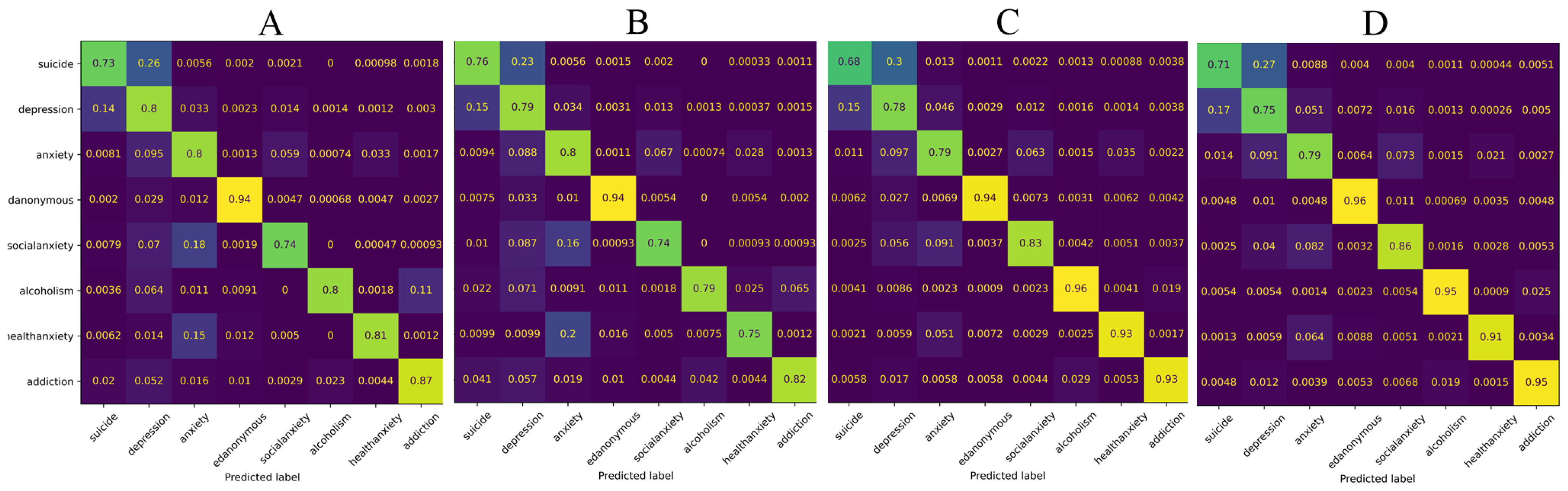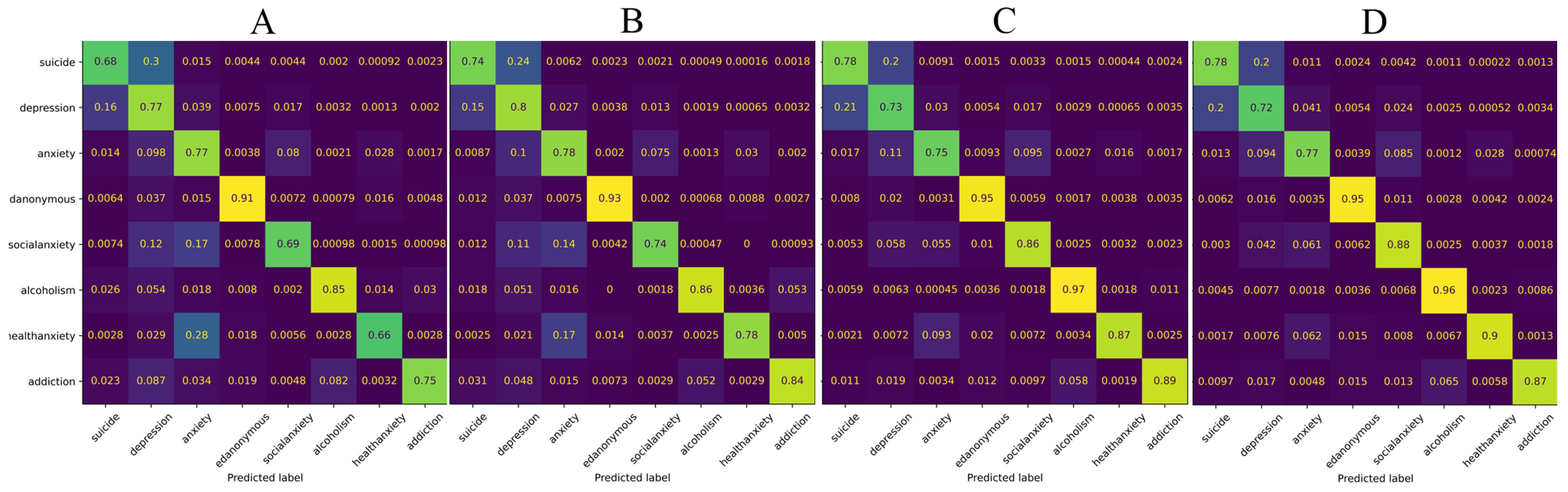 Table 6), respectively. Through comparative analysis of these confusion matrices, We found some correlation between eight categories in the dataset used in this study (depression, suicide, anxiety, social anxiety, edanonymous, health anxiety, addiction, alcoholism). Among them, the edanonymous category was most easily correctly identified by the model, while the confusion between depression and suicide was high, indicating a strong correlation between them. There is also a degree of confusion between suicide and anxiety. Although the direct correlation between health anxiety and social anxiety is not strong, they have some correlation with the anxiety category.