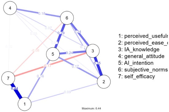 The integration of network analysis into TAM research represents a novel approach to mapping user perceptions. Researchers may use network analysis to depict and study the complex interactions and interdependencies across numerous TAM components, including PU, PEOU, AI knowledge, general attitude, AI intention, subjective norms, and self-efficacy [,]. This study uses network analysis to give a more detailed understanding of how these constructs interact and impact one another in the context of AI adoption in accounting and auditing. Network analysis provides a thorough examination of the direct and indirect interactions between TAM constructs, providing insights into the underlying mechanisms that drive technology acceptance. This approach addresses the gap in the literature by mapping user perceptions of AI in accounting and auditing, a context where previous studies have not fully explored the interplay between different acceptance factors.