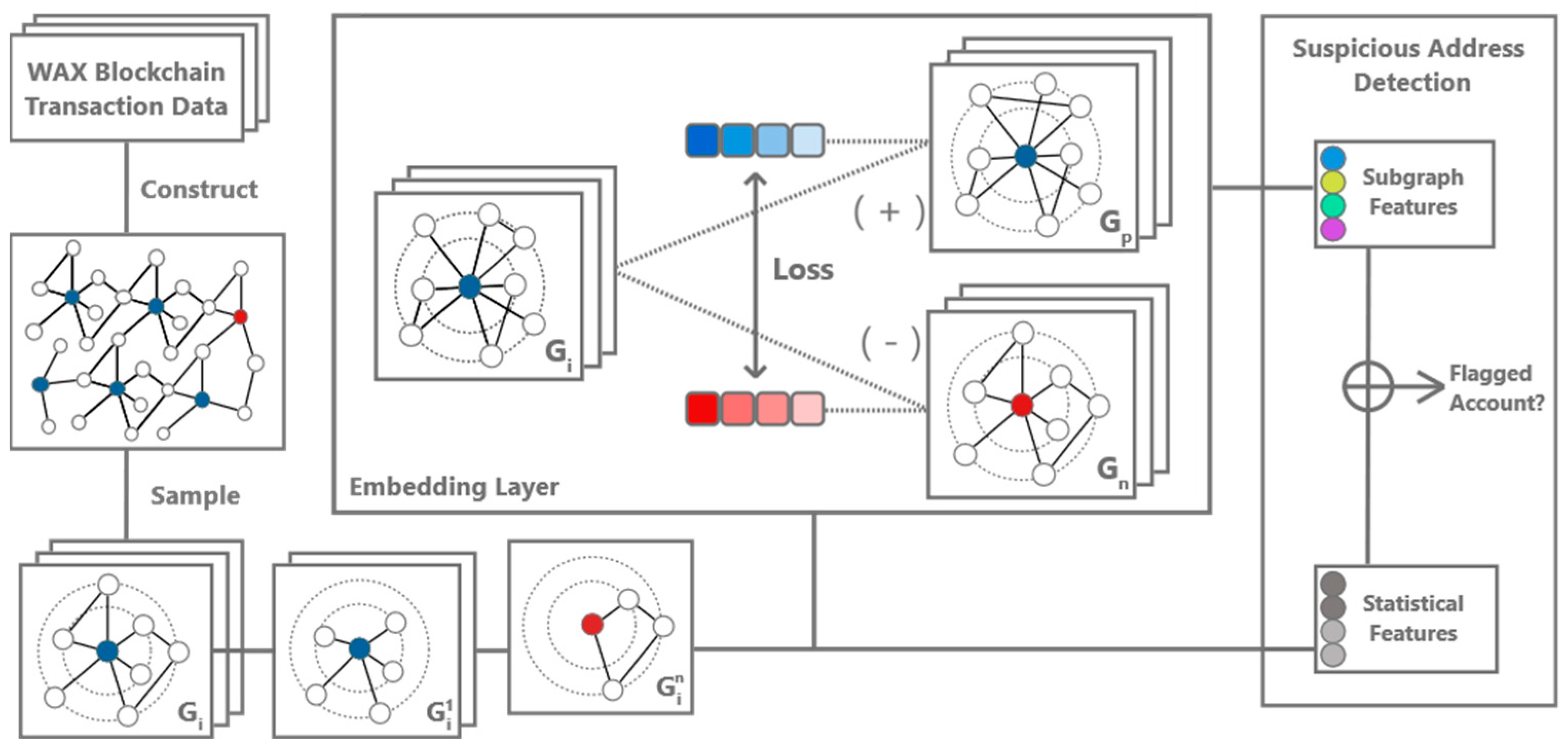 Figure 2) is founded upon a comprehensive analysis of blockchain transactions, aimed at identifying and categorizing suspicious and fraudulent activities. This initiative is driven by the objectives of enhancing trust and transparency among all participants within blockchain networks. By integrating machine learning approaches with principles of graph representation learning, the model seeks to identify transaction patterns within blockchain ecosystems, differentiating legitimate users from potentially malicious actors.