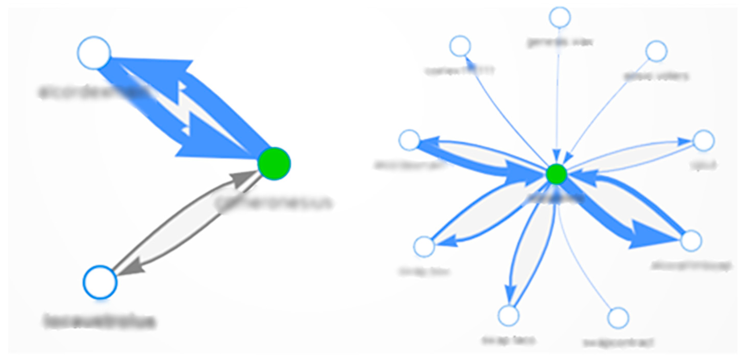 False positives, on the other hand, involved addresses that exhibited similar characteristics to suspicious addresses. For instance, certain star addresses were noted for receiving transfers from multiple distinct users while sending out to only a few. These addresses can be mistakenly identified as fraudulent due to their high volume of incoming transactions from diverse sources. However, these activities might not necessarily indicate malicious intent but could represent a hub in a legitimate business or community network.