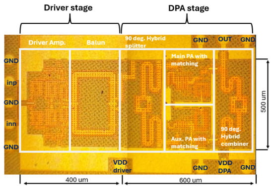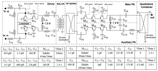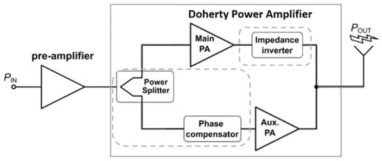 - Kim, S.; Park, H.-C.; Kang, D.; Minn, D.; Yang, S.-G. A 24.5–29.5 GHz Broadband Parallel-to-Series Combined Compact Doherty Power Amplifier in 28-nm Bulk CMOS for 5G Applications. In Proceedings of the IEEE Radio Frequency Integrated Circuits Symposium (RFIC), Atlanta, GA, USA, 7–9 June 2021; pp. 171–174. [Google Scholar] [CrossRef]