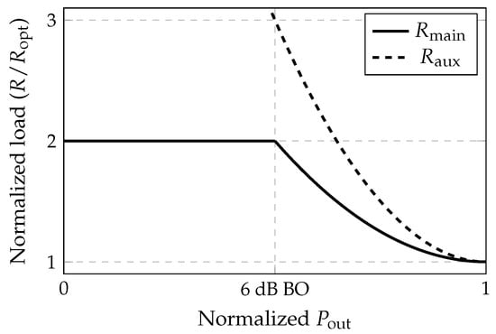 As depicted, by using a quadrature hybrid as an output combiner, the impedance seen at the drain of the main amplifier is inversely proportional to the auxiliary amplifier current. This is similar to the load modulation when the transmission lines are used as impedance inverters in the conventional DPAs [] as shown in Figure 2.