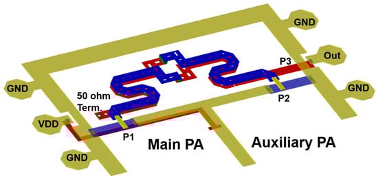 The driver output is converted to a single-ended signal by a BALUN and then split by an input quadrature hybrid (identical topology to the output hybrid) to feed the main and auxiliary paths with a nominal split and 90° phase difference. Using a quadrature hybrid at the input is deliberate: it preserves amplitude/phase balance over the 8–15 GHz span, stabilizes the Doherty drive ratio with frequency, and provides port isolation that desensitizes the main/auxiliary excitation to device and matching dispersion. Since it is identical to the output combiner, it tracks any change affecting the output combiner ensuring robust DPA operation against process variations.
