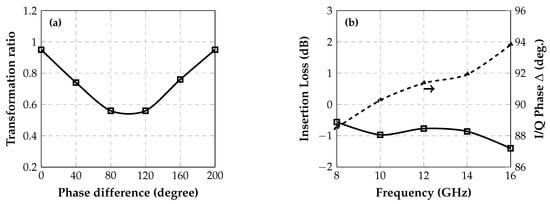 Figure 4a shows the simulated impedance transformation ratio at the drain of the main amplifier versus the phase difference in the signals at the output of the main and auxiliary amplifiers at 10 GHz. As indicated, a transformation ratio of 0.5 is obtained at 90° phase difference. Simulation results in Figure 4b show that the hybrid achieves an insertion loss below 1.2 dB and a phase imbalance within ±3° across frequency from 8 to 15 GHz. This phase imbalance is consistent with the theoretical calculations in Section 2.2.