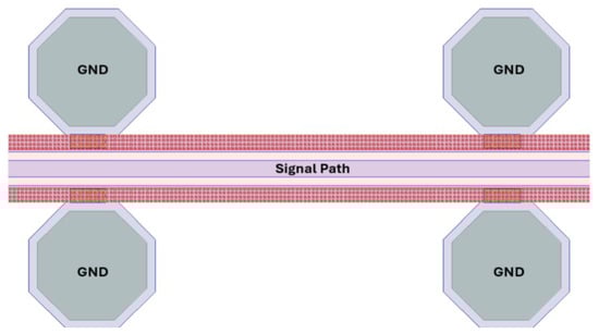 To quantify the compactness advantage of the quadrature hybrid as an impedance inverter, we synthesized a CPW transmission line at 10 GHz. Only a short segment is shown in Figure 5 because the full line is ≈4 mm long (the free-space quarter wavelength would be ∼7.5 mm but on-chip ). The CPW employs a 10 µm signal strip with ground rails placed 5 µm away on each side (rail width 10 µm), giving a total width ≈40 µm and an area mm µm = 0.16 mm2. In contrast, the quadrature-hybrid combiner occupies only ∼600 µm in length with 20 µm lines, corresponding to µm µm = 0.012 mm2, i.e., a footprint reduction of ≈ 92.5% ( smaller).