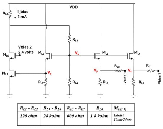 To ensure reliable operation at the chosen and given the ednFET drain breakdown of ∼ in the GF 22 nm FD-SOI process [], both the main and auxiliary PAs use a three-stacked-FET configuration with . With proper voltage sharing, each FET sustains roughly , so the stack accommodates overall—sufficient for the main stage to reach ≈ and for the Doherty to attain ≈.