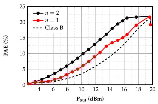 In the ideal conventional DPA, the sizing of the main and the auxiliary PAs should be equal to get dB but realistic non-idealities enforce the FET size of the auxiliary amplifier to be larger than that of the main amplifier to achieve peak PAE at 6 dB back-off yielding the theoretical asymmetric DPA to achieve the theoretical PAE of the symmetric DPA. Figure 10 shows the simulated DPA PAE at 10 GHz versus the ratio between the FET size of the auxiliary amplifier and the FET size of the main amplifier (n). Also, Figure 10 compares the simulated PAE of the proposed DPA to the PAE of the class B PA. Choosing n = 2 causes the DPA to have superior PAE compared to the DPA of n = 1 and class B PA.
