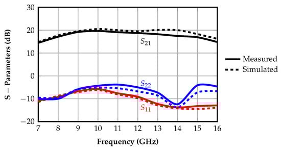 The micrograph of the PA implemented in GF 22 nm FD-SOI is shown in Figure 12. The two-stage PA occupies 0.5 mm2. RF and dc biasing signals are applied and monitored using on-wafer probing to reduce losses and mismatches introduced by measurements. Differential GSGSG pads are employed for the input, while single-ended GSG pads are utilized for the output. Figure 13 shows measured and simulated S-parameters where a peak gain of 19.6 dB is achieved with 3 dB small-signal gain bandwidth from 8 to 15 GHz.