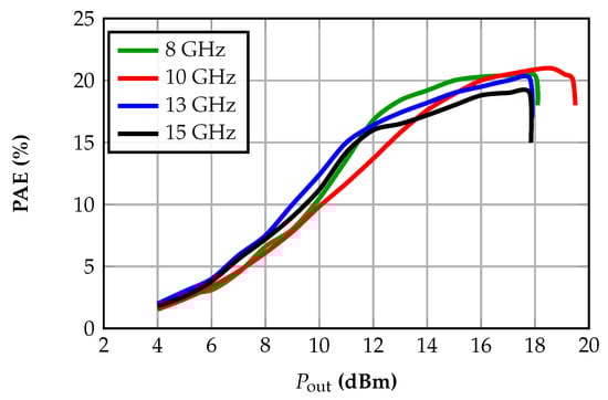 As depicted in Figure 18, PAE at 6 dB back-off remains consistently high across 8–15 GHz (varies between 17% and 15%), demonstrating that the Doherty mechanism is active and effective over the full span, not just near saturation.