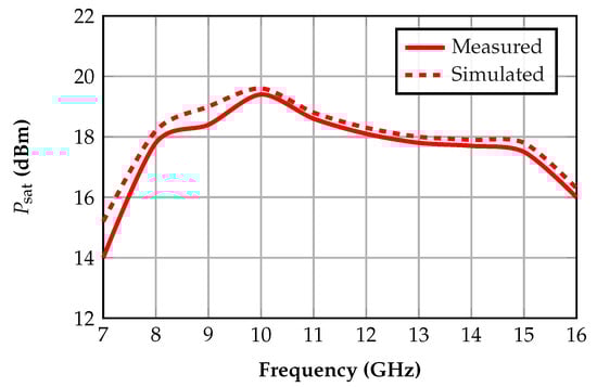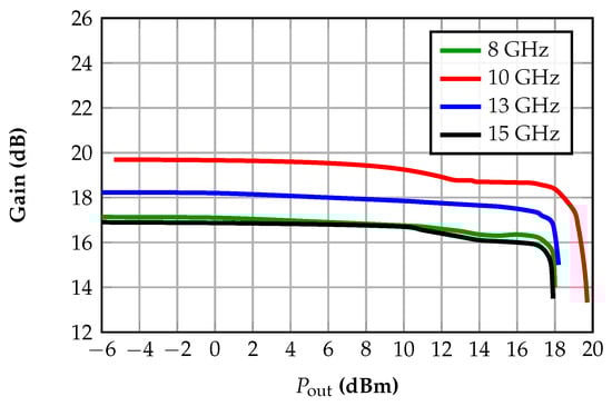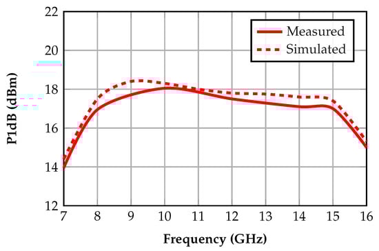 , shown in Figure 15, remains broadly consistent across the band as the maximum value is 19.6 dBm while the minimum is approximately 18 dBm, confirming that the combining network presents an optimum load to the core devices from 8 to 15 GHz. In practical terms, this means the design does not trade bandwidth for a narrow efficiency/saturation peak. The measured 1 dB compression point, shown in Figure 16, follows the same gentle frequency dependence as as it constrained between 17 and 18 dBm across the band.