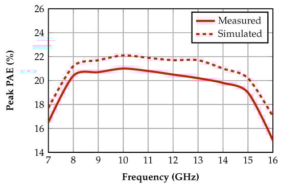 Peak PAE, reported at P1dB, varies less than 2% across frequency and reaches its maximum (21%) near mid-band as shown in Figure 17. Together with , this figure confirms the core premise: the hybrid-based network yields practical broadband efficiency.