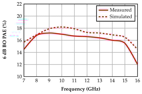 Measured versus simulated PAE—6 dB back-off across frequency.