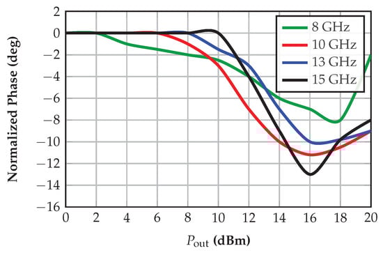 Measured AM–PM: normalized phase versus at 10–14 GHz.