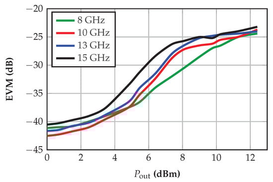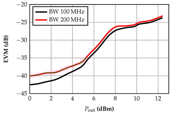 For the proposed modulation scheme at 10 GHz, EVM degrades gracefully with increasing output power reaching a maximum of −24.3 dB at the average Pout (7 dB back-off) and this gets elevated to −24.1 dBc at 200 MHz modulation bandwidth as shown in Figure 22. The small delta between the 100- and 200 MHz cases implies that frequency-dependent gain/phase ripple and bias dynamics are not significantly exacerbated by the wider signal, which strengthens the argument for bandwidth robustness.