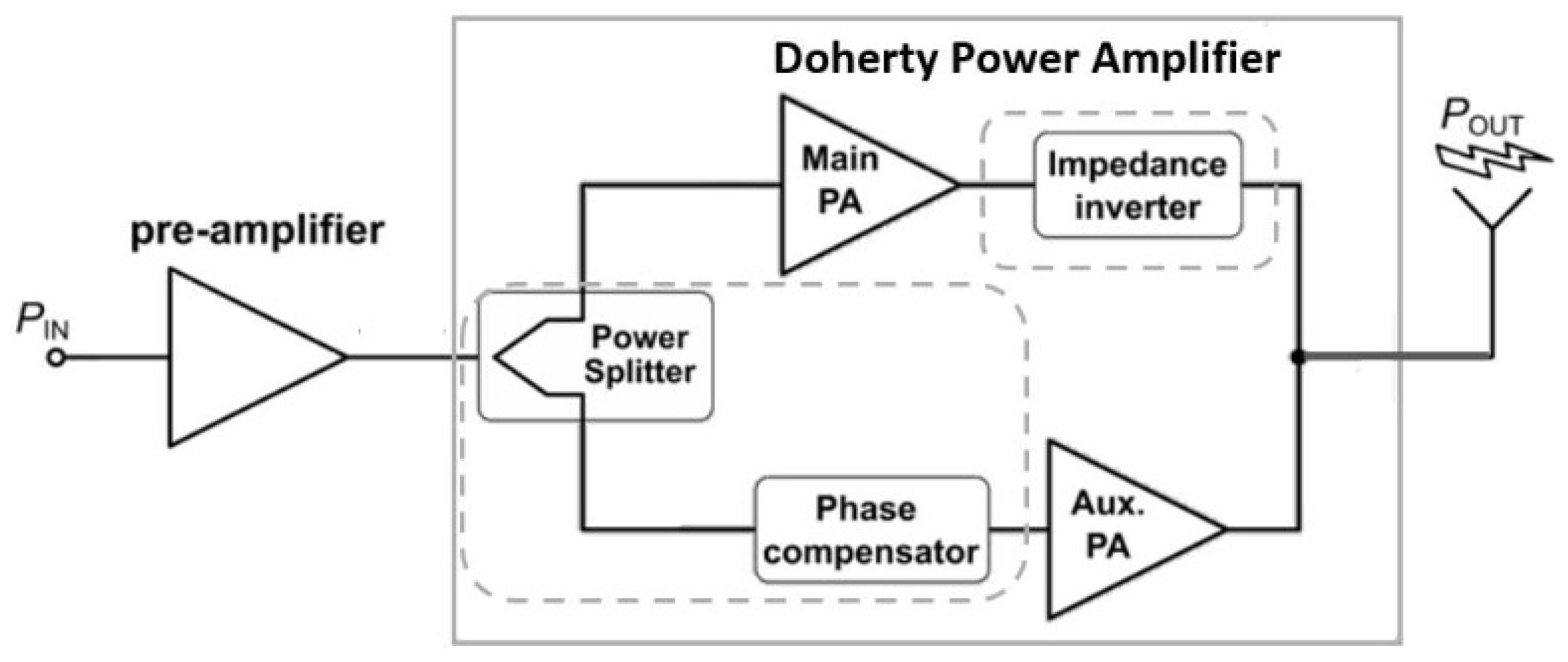 - Grebennikov, A.; Bulja, S. Doherty Power Amplifiers: A Tutorial. IEEE Microw. Mag. 2012, 13, 100–114. [Google Scholar]