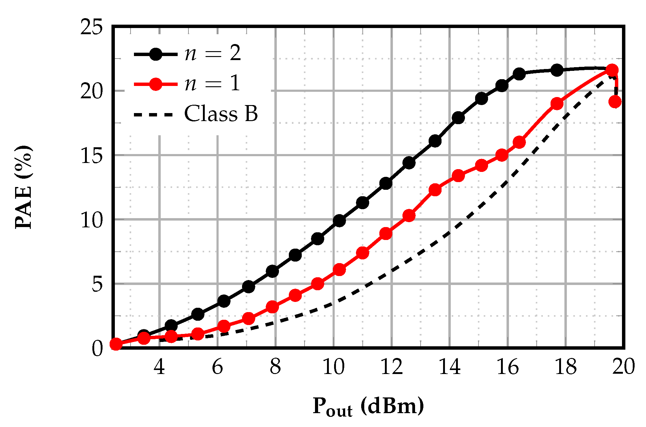 - Predicted peak efficiency: The combined two-path target is (), giving an idealized peak drain efficiency of