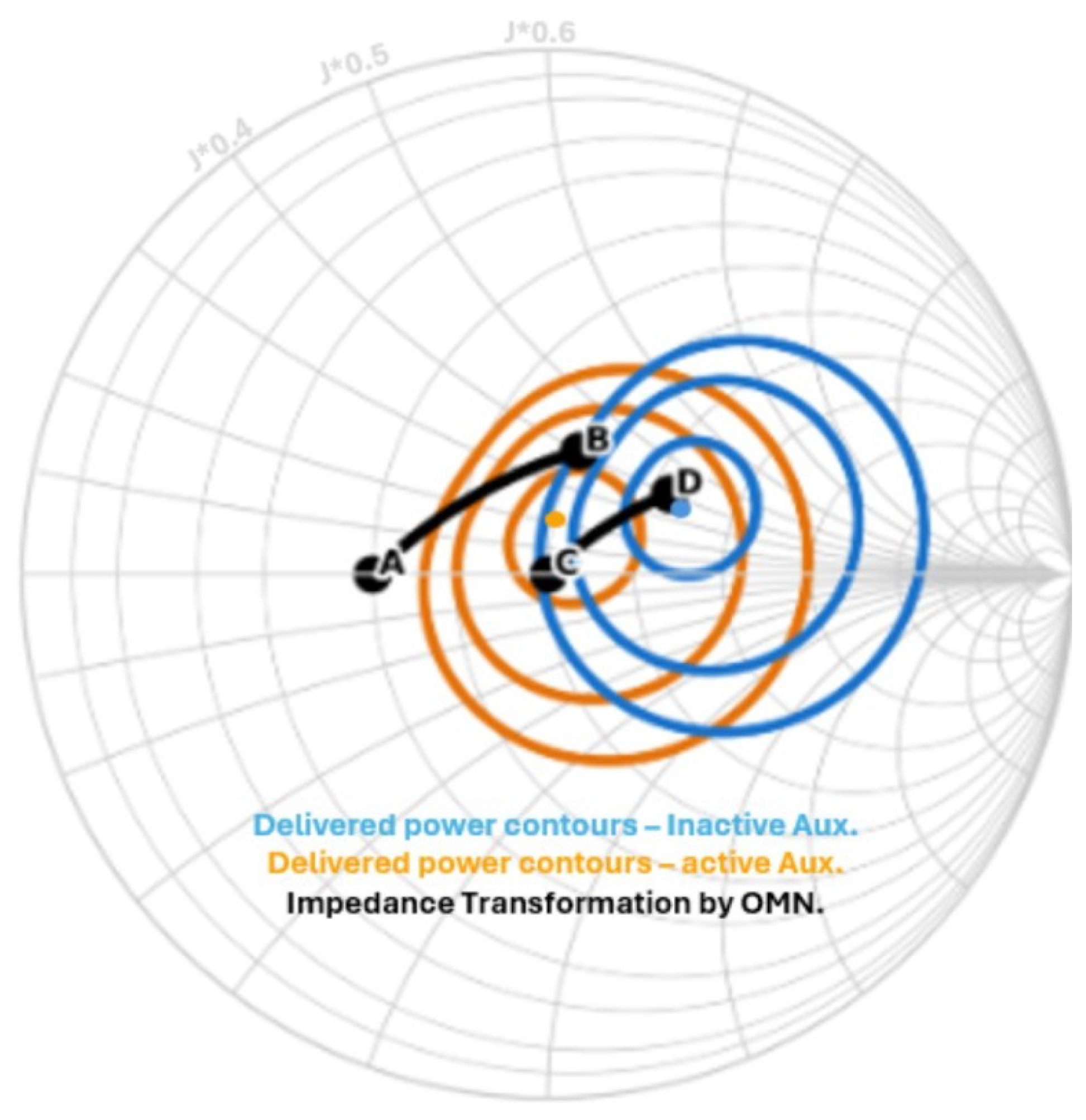 - A compact quadrature-hybrid-based Doherty topology that replaces lossy on-chip inverters while preserving the Doherty load-line trajectory.