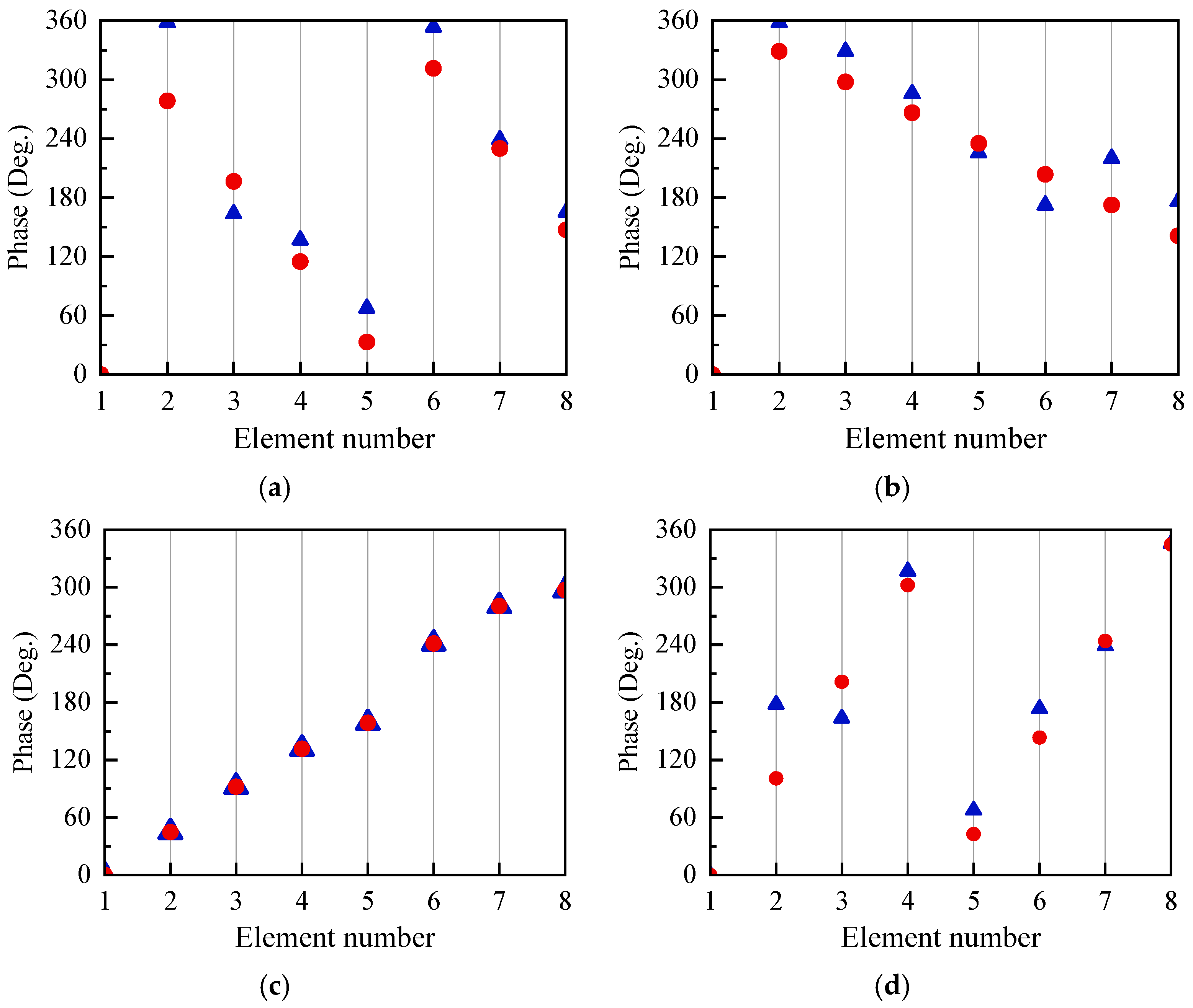 - Jiang, W.; Guo, Y.C.; Liu, T.H.; Shen, W.F.; Cao, W. Comparison of random phasing methods for reducing beam pointing errors in phased array. IEEE Trans. Antennas Propag. 2003, 51, 782–787. [Google Scholar] [CrossRef]
