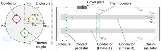 The distribution of the thermocouple locations on the GIS is shown in Figure 2. This experiment uses T-type thermocouples (copper–constantan), with a temperature measurement range of 0–200 °C and Class I accuracy (error of 0.1 K). Thermocouples are primarily placed on the surface of the enclosure and the busbar conductor. The thermocouples are affixed to the designated spots using 1 cm × 1 cm copper foil and secured with high-temperature-resistant cable ties to ensure close contact with the measurement points, thus guaranteeing the accuracy of the experimental data, as shown in positions ② and ④ in Figure 1.
