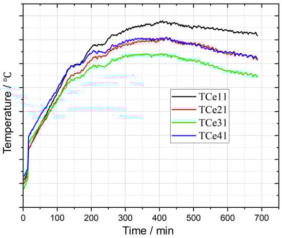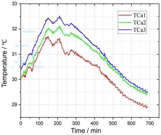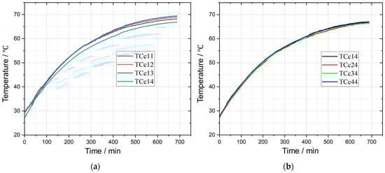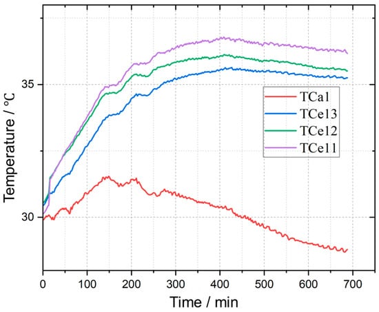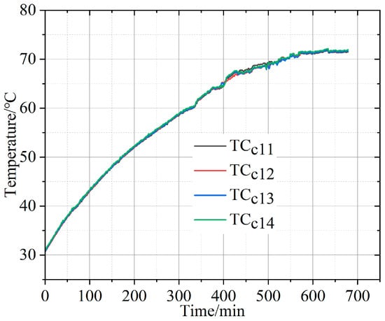 As depicted in Figure 8a, the temperature rises in the conductors along the same axis are essentially consistent, with thermocouple TCc14 showing a lower starting temperature, hence maintaining a lower position throughout the temperature evolution. Figure 8b indicates that the temperature rises in conductors on the same cross-section are almost entirely consistent, with a temperature difference between the upper and lower positions not exceeding 1 K. This suggests that inside the GIS enclosure, the temperature rise in the conductors is primarily governed by heat conduction, and the overall resistance of the conductors remains uniform during the current flow, leading to consistent heat-induced temperature rises. The test lasted 11 h, but the internal conductors’ temperature rise did not reach a steady state by the end of the test, partly due to changes in the external environment and because the load current was continuously fluctuating within a small range. From Figure 9, we can observe the same trend of change. Therefore, the temperature evolution characteristics are consistent under multiple current conditions.