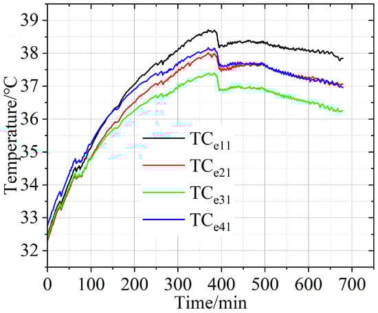 As shown in Figure 4, thermocouple TCe11, located directly above the enclosure, experiences the largest temperature rise, while thermocouple TCe31, positioned directly below the enclosure, has the smallest temperature rise. The thermocouples on the sides, TCe21 and TCe41, have temperature rises between those of TCe11 and TCe31. In the early part of the temperature rise test, when the conductor’s temperature increase rate is higher, the temperature rises in the four thermocouples on the enclosure cross-section are similar. This may be due to the heat transferring from the conductor to the enclosure; initially, the heat needs to pass to the gas inside the GIS enclosure before transferring to the enclosure, indicating that convection is the main mode of heat transfer within the GIS enclosure. From Figure 5, we can observe the same trend of change.
