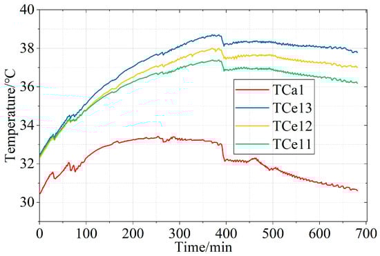 At the start of the temperature rise test, the external ambient temperature around the GIS busbar was concurrently recorded, as illustrated in Figure 3.