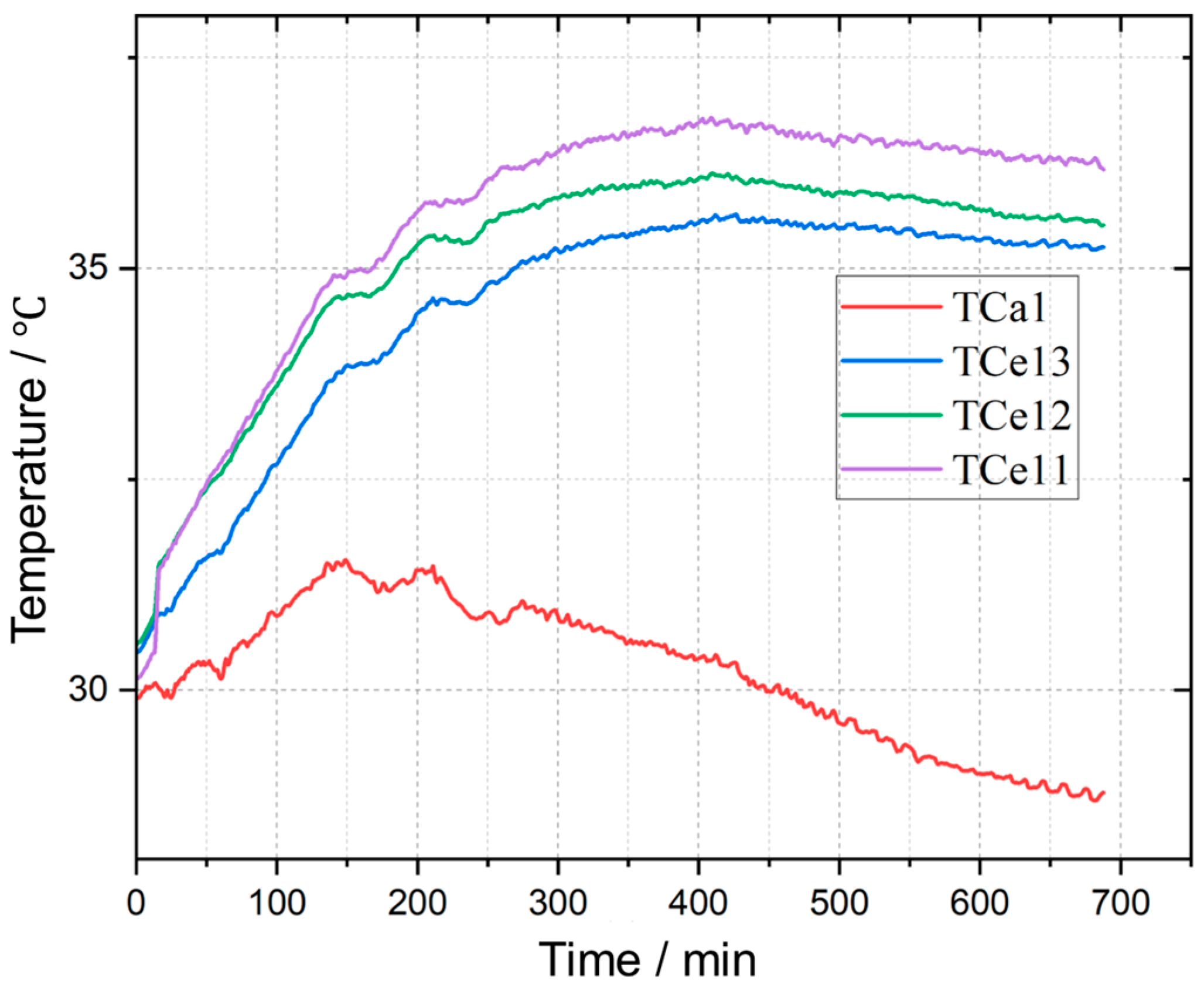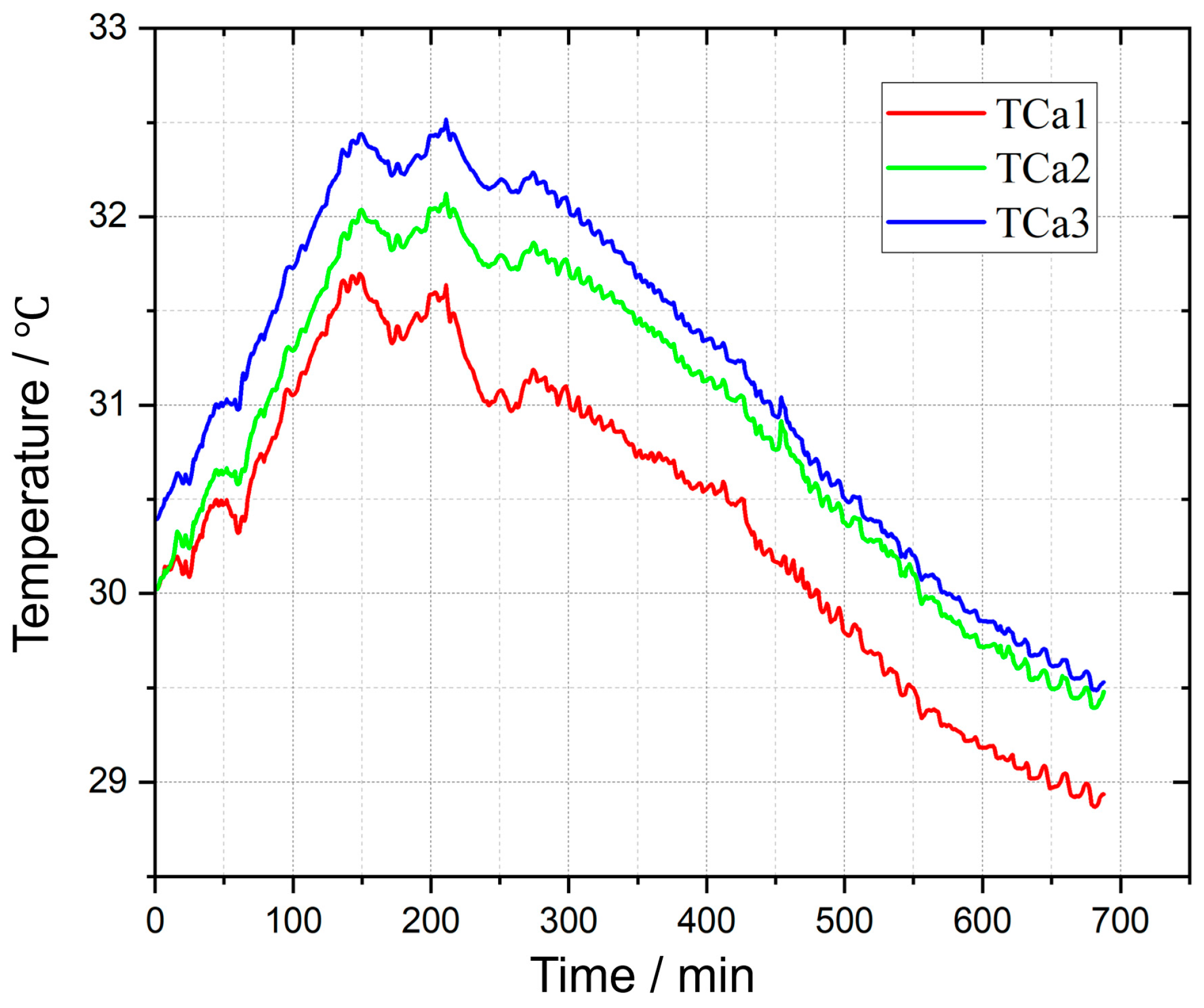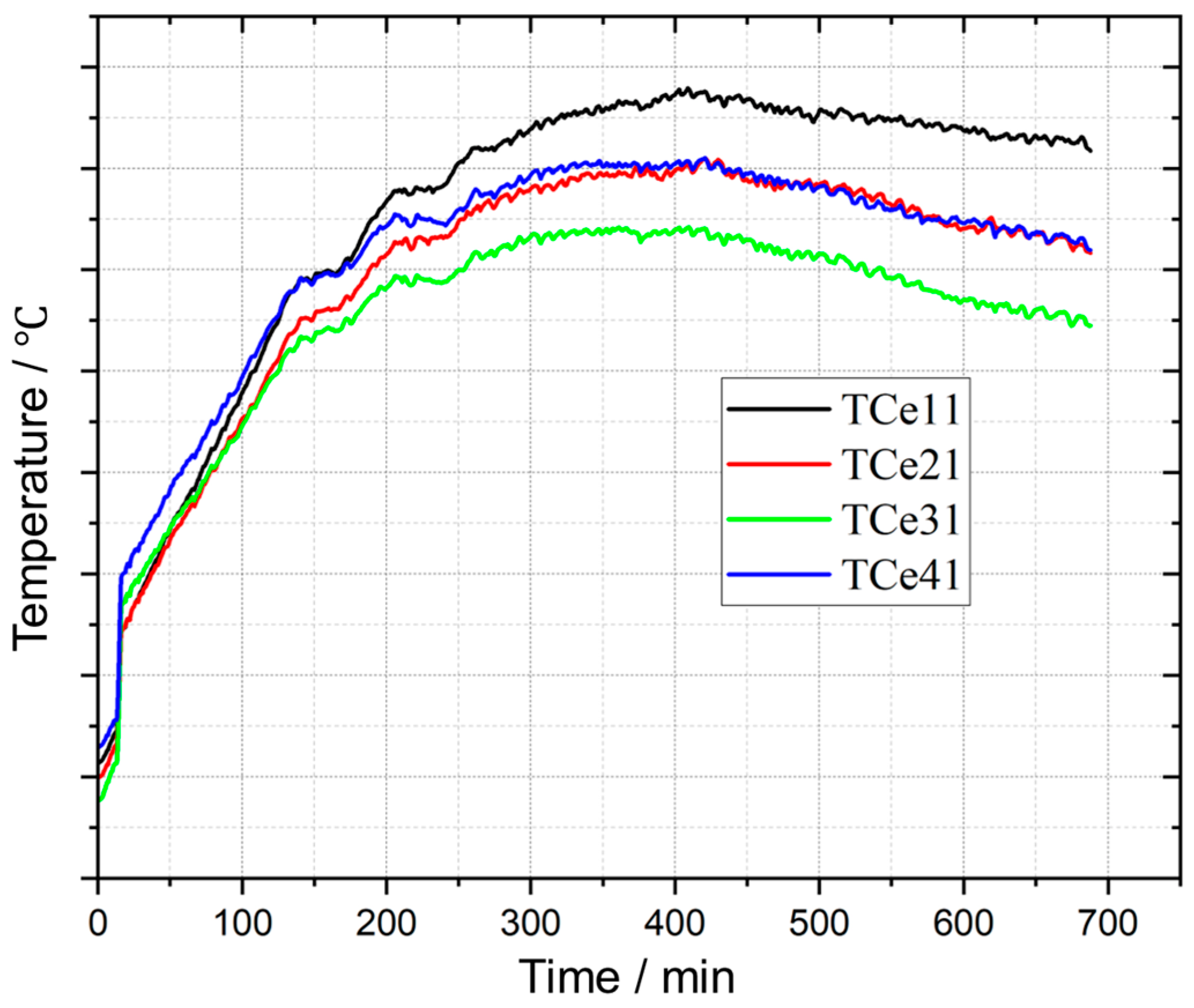 | Phase | Thermocouple Number | Starting Temperature/°C | Ending Temperature (680 min)/°C | Temperature Rise/K |