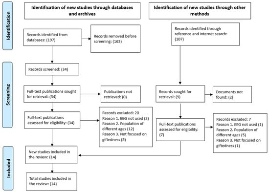 A total of 197 records were retrieved from the selected databases (PubMed = 26, Scopus = 42, Web of Science = 115, IEEE Xplore = 10, PsycINFO = 4). In addition, 107 further records were identified through reference lists and external searches (Google Scholar, ResearchGate, SpringerLink), but these were processed separately. During the initial screening phase, 163 of the 197 database records were excluded after inspection of title and abstract. The reasons for exclusion were the absence of at least one of the main criteria, such as the use of EEG as the primary tool, the inclusion of gifted or high-ability populations, or the appropriate age range. This step corresponds to the identification stage of the PRISMA process and ensured that only potentially eligible articles were considered for full-text assessment. After this refinement, 34 database articles and 7 from other sources were evaluated in full text. Of these, 20 were excluded for specific reasons (n = 3 no EEG, n = 12 inappropriate age, n = 5 not focused on giftedness). Ultimately, 14 studies met all criteria and were included in this scoping review (Figure 1).