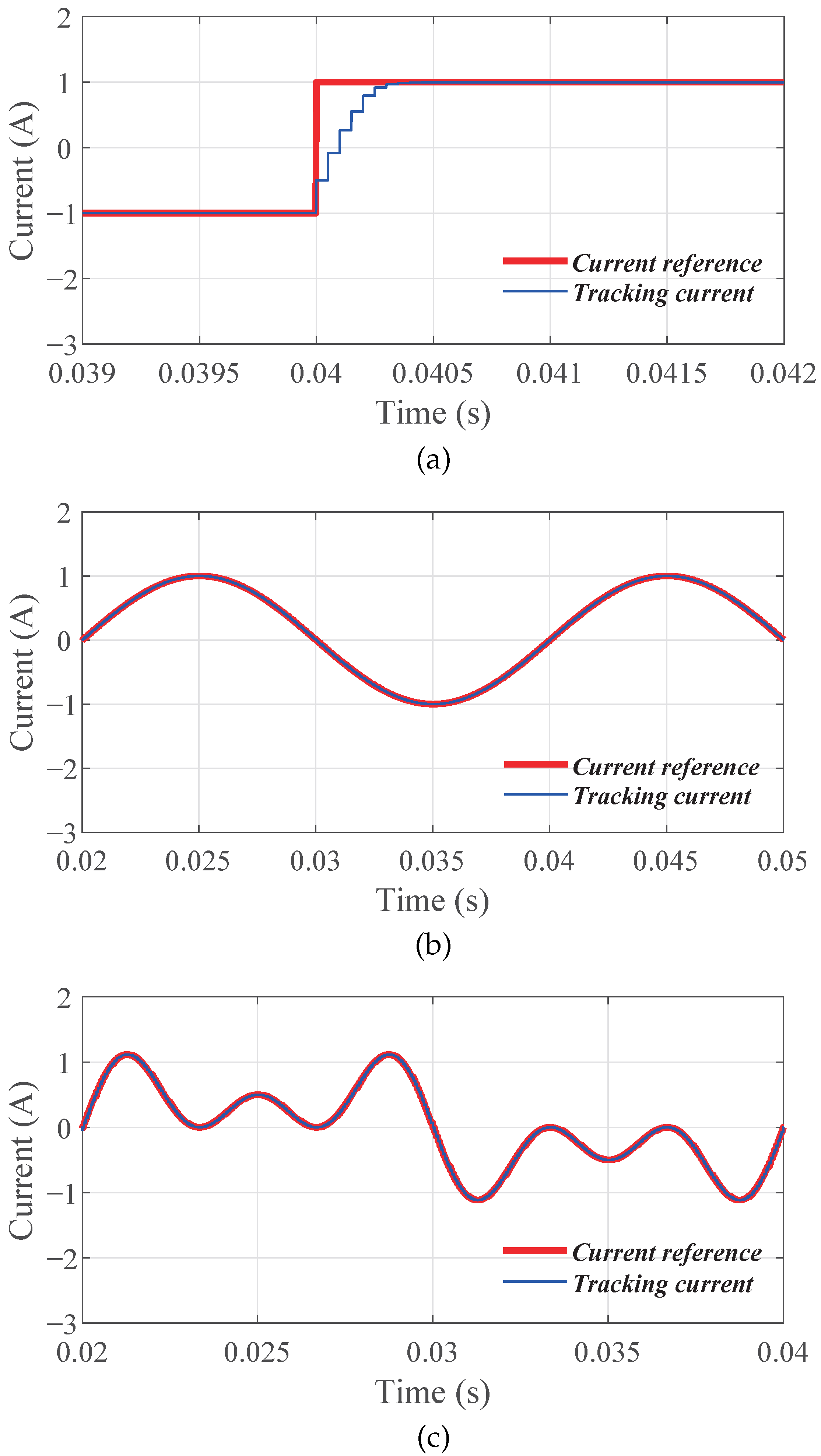 Figure 8b,c demonstrate that the controller achieves zero steady-state error when tracking a sinusoidal reference and a sinusoidal reference with harmonic content, respectively. Importantly,