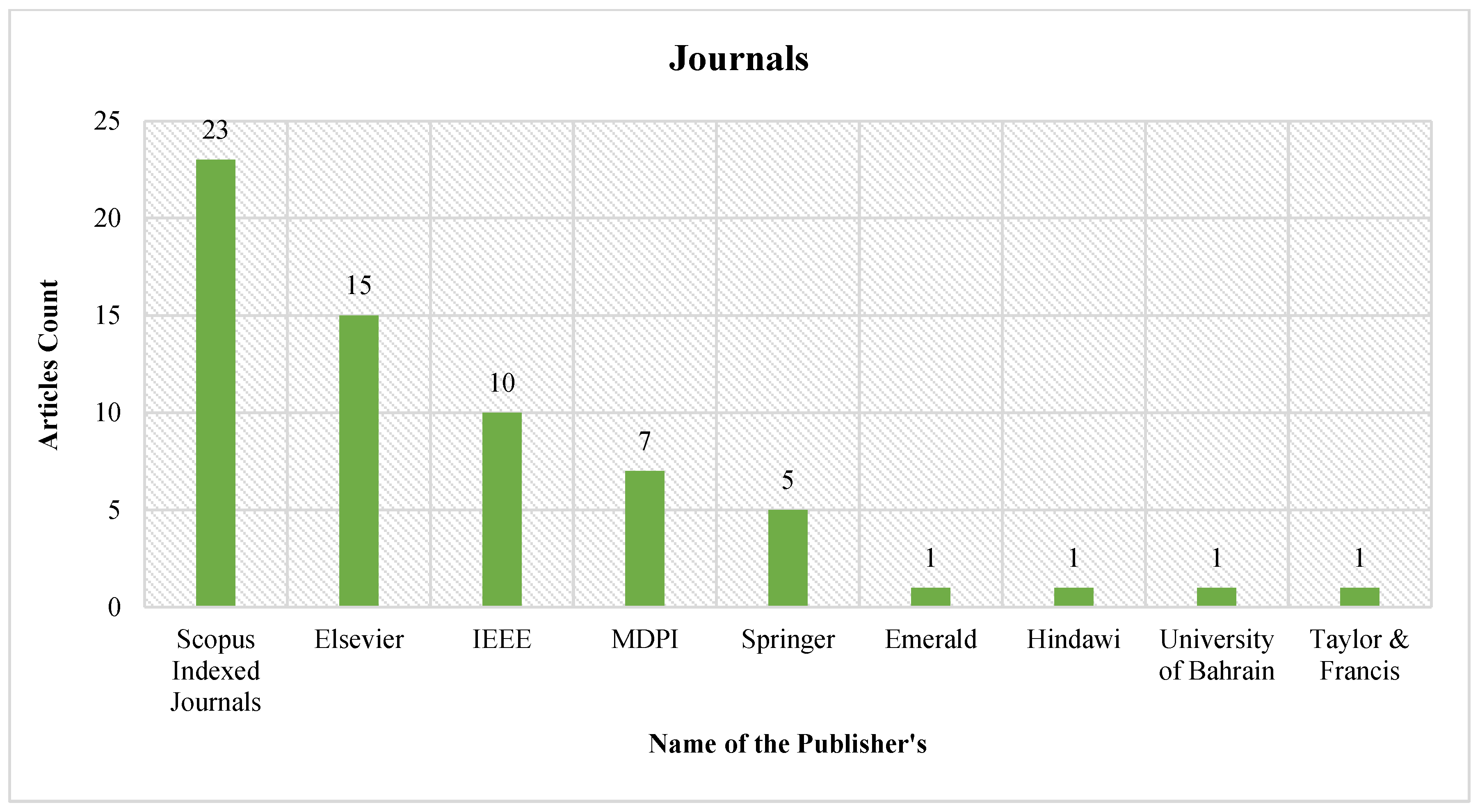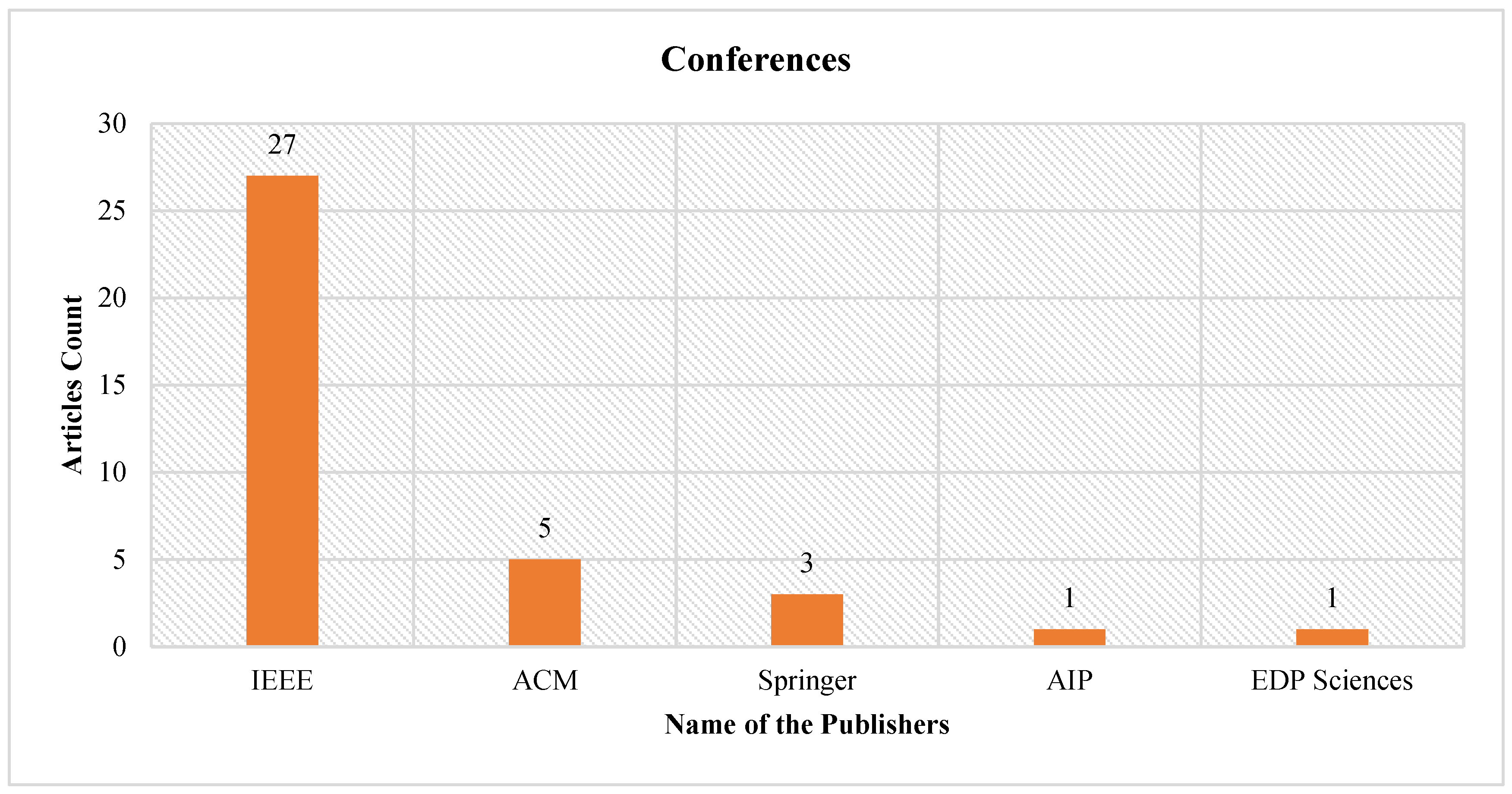 Figure 2. The papers were categorized into two groups: conference papers and articles. For conference papers, IEEE Xplore leads with 73% of the focus (27 papers), followed by ACM and Springer, with 14% (5 papers) and 8% (3 papers), respectively. With 36% of the articles selected, journals indexed by Scopus received the most attention (23 papers), followed by ScienceDirect (23%; 15 papers), IEEE (16%; 10 papers), and MDPI (11%; 7 papers).
