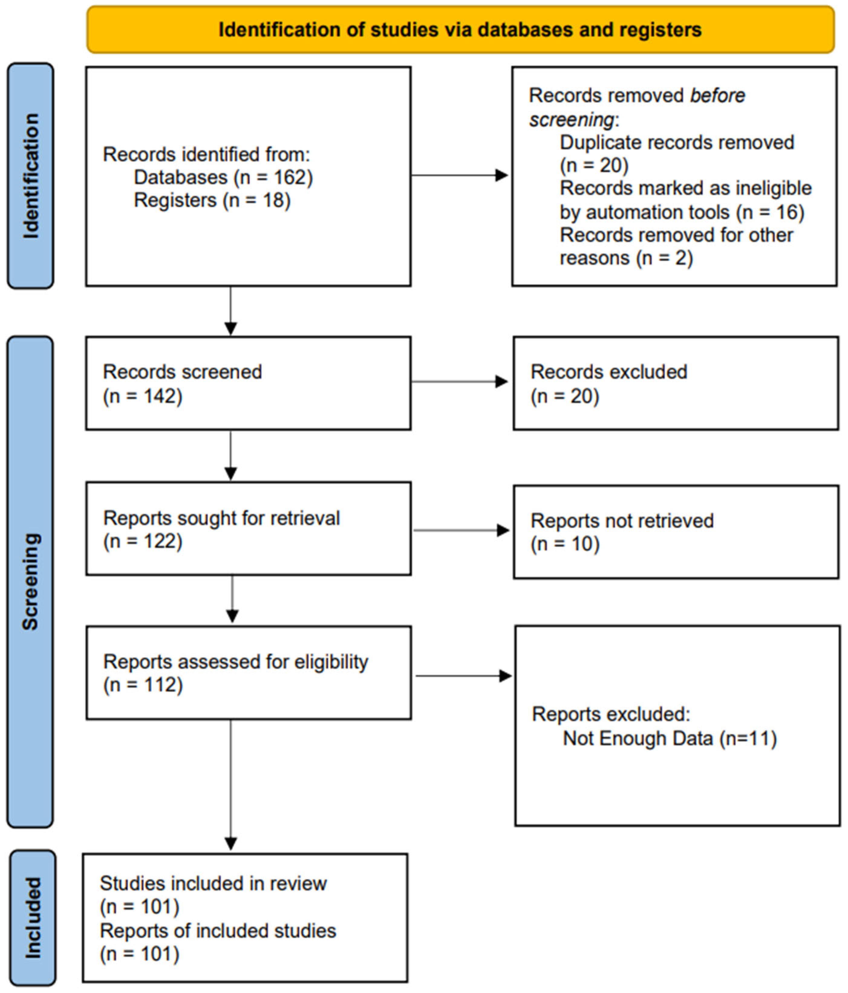 The search selection parameters demonstrate how we focus on the relevant content returned by search engines. Our goal is to find primary publications on our subject that address our research questions. A total of 101 studies were selected from various databases. The study analysis (