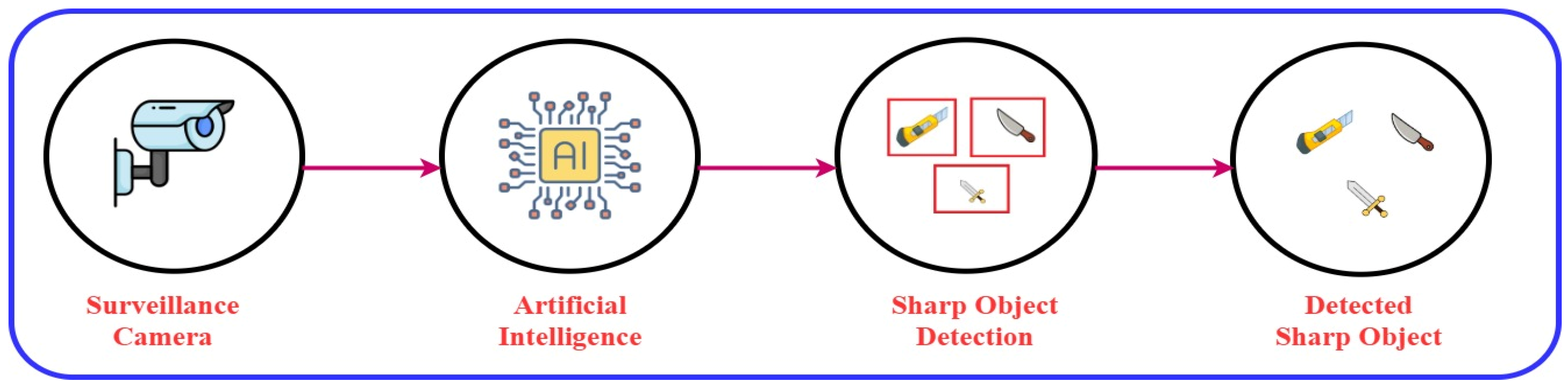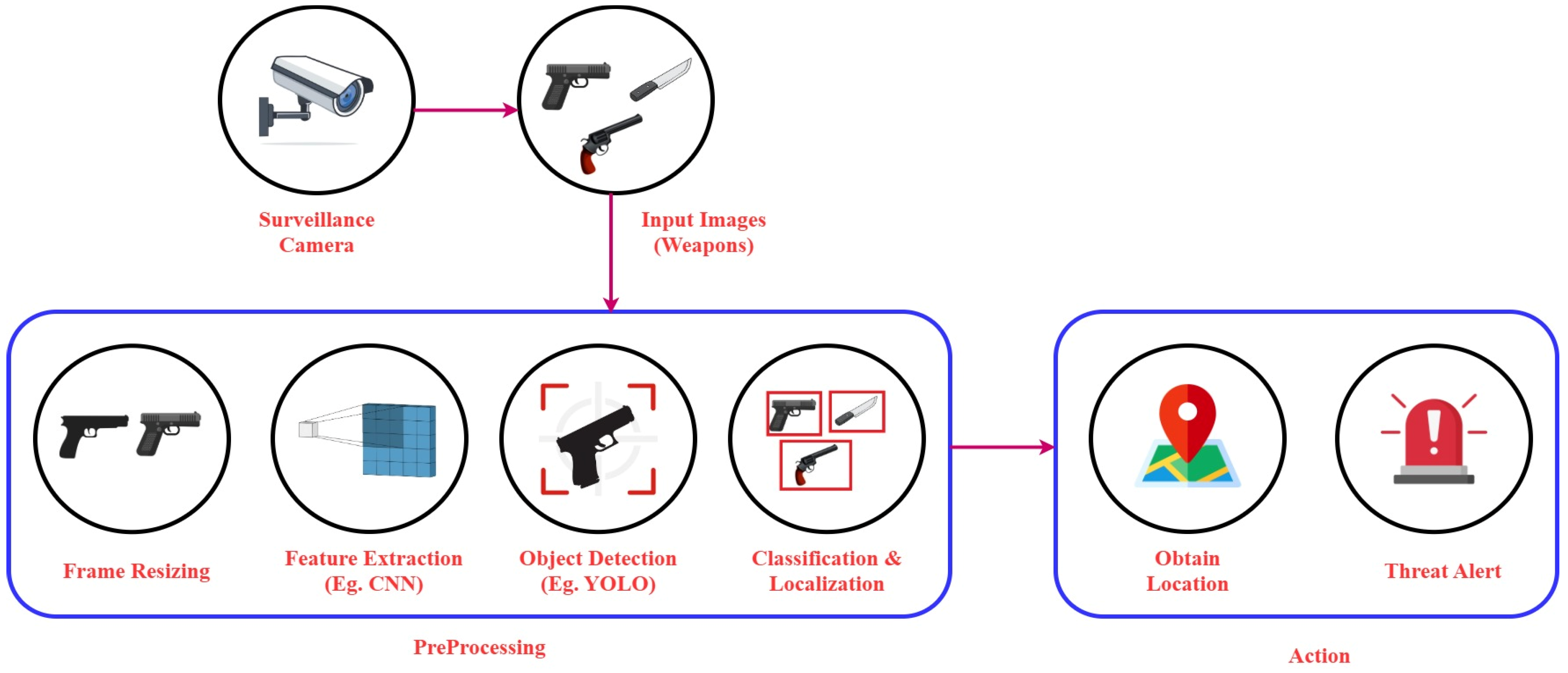 Figure 6 illustrates the comprehensive workflow of an AI-based weapon-detection system that complements surveillance cameras to provide real-time information on potential threats. Surveillance cameras capture video footage and provide continuous images as input, which may contain potential weapons (e.g., knives, guns). Images of potential weapons undergo a preprocessing step that resizes all frames to usable dimensions and omits unnecessary visual features using convolutional neural networks (CNNs). Preprocessed or volunteer frames are submitted for analysis by an object detection model (e.g., YOLO) to report on the identification and localization of the weapon in the images (i.e., bounding box and weapon classification). Once a weapon is identified and localized, the algorithm takes action, determining its location and automatically generating a threat alert to notify security staff of the weapon requiring immediate attention. The demonstration of the threat capture pipeline highlights an efficient, end-to-end AI-driven approach that leverages computer vision, deep learning, and intelligent alerting. The efficiency of functions combines to increase situational awareness and improve safety and security, specifically in surveillance.