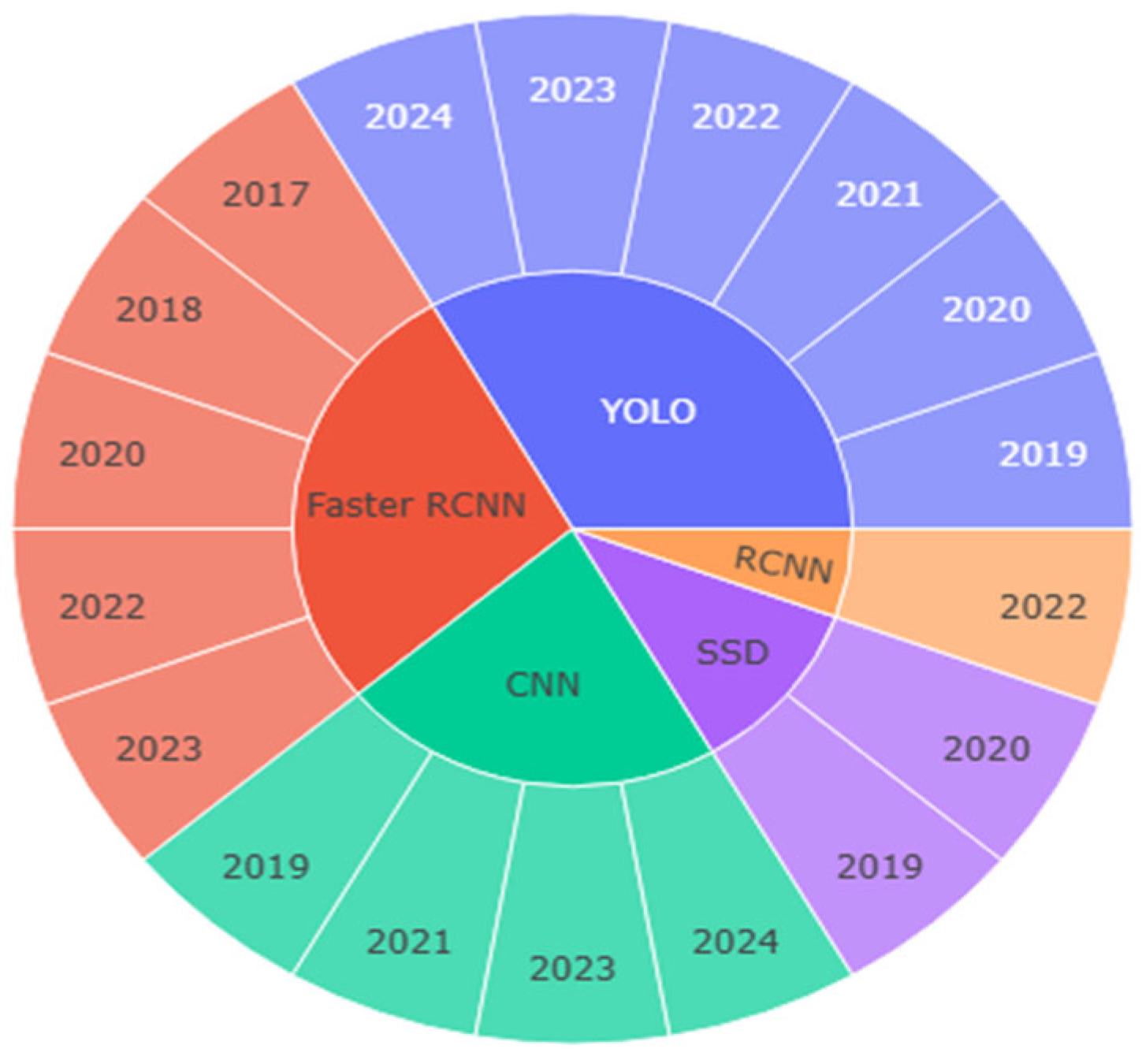 Figure 7 illustrates the chronological timeline of the YOLO (You Only Look Once) family of object detection algorithms, starting from 2015 (the original YOLO), and addresses developments that continued until 2025. The YOLO development process began with the original YOLO implementation, YOLOv1, introduced in 2015. The introduction of YOLOv1 enabled real-time object detection with a single neural network. YOLO development rapidly progressed to YOLOv2 in 2016, using improved accuracy and speed through architecture advances. Following the YOLOv2 release, YOLOv3 introduced improvements in multi-scale detection and feature extraction by using deeper convolutional layers in 2018. YOLOv4 and YOLOv5 were launched in 2020, using the CSPDarknet architecture and incorporating new training-time optimizations. YOLO tracking models offer faster performance and have been widely adopted in real-time computer vision tasks. YOLOv6 and YOLOv7 follow the FIR approach, which was released in 2021. These models utilize optimizations that improve both efficiency and accuracy, making them suitable for edge devices. In 2023, YOLOv8 introduced transformer-based applications and trained heads for the detection task. YOLOv9 through YOLOv12, which emerged between 2024 and 2025, represent the next generation of architecture, integrating transformer augmentation, improved feature fusion, and adaptive learning. In summary, the trajectory of advances in YOLO model families reflects continuous innovations and refinements to YOLO model designs and research, ultimately leading to improvements in real-time object and weapon detection.