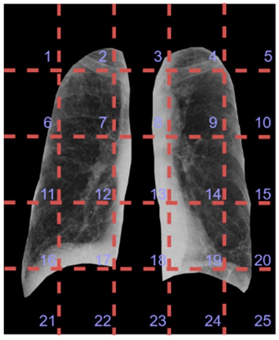High-resolution chest X-ray images are divided into 5 × 5 subregions.