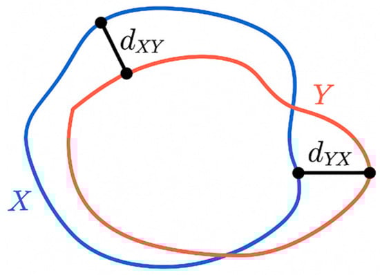 Components of the calculation of the Hausdorff distance between the blue curve X and the red curve Y.