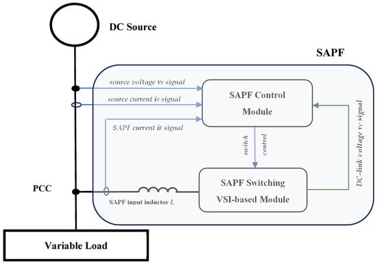 Among the many possible classifications, DC voltage sources can be considered as supplying/accumulating energy directly, i.e., in the form of electromagnetic fields, or through electromechanical or electrochemical conversion. They have different functional properties that predispose them to different applications, sometimes in the form of combinations of different types of energy storage systems [,]. This article is devoted to the use of SAPF to improve the operating conditions of sources with electrochemical conversion of energy, i.e., batteries and fuel cells. In these systems, the operating conditions of energy sources deteriorate due to changes in the load current, including step and oscillatory changes. Such components of the supply current can be classified as non-active current, which can be eliminated from the circuit by using a SAPF.