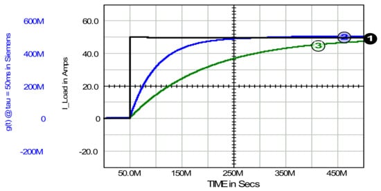 Figure 2 and Figure 3 verify the conductance signal formula (15), showing its response to a step load change for two time constants τ. The SAPF parameters are as follows: DC-link capacitor C = 50 mF, its initial voltage VDC-link_ini = 500 V, smoothing inductance L = 2 mH. Source voltage Vs = 100 V and its internal resistance RS = 20 mΩ. The load is a pure resistance Rload = 2 Ω. The time constants τ, see (16) and (17), were assumed to be 50 ms and then 150 ms. Note, the corresponding source current waveforms, given by (18), are proportional to the conductance signals 2 and 3.