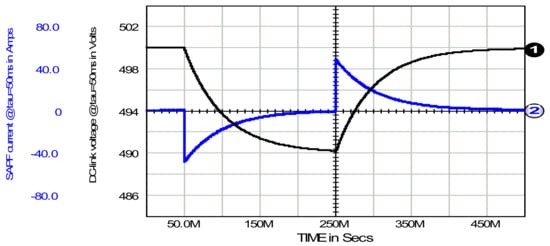 In the time period from 200 ms to 1.1 s, the DC-link capacitor is supplied from the higher voltage side with a power of 5.9 kW; Figure 12. On the lower voltage side, a 5 kW load is switched on twice: in the period from 600 ms to 900 ms and then from 1.2 s to 1.6 s. As a result, the total energy drawn by this load is 3888 J. During the entire period of the DC-link capacitor’s active operation, i.e., from 200 ms to 1.6 s, its energy balance is: 5320 J delivered minus 3888 J drawn, resulting in a surplus of 1432 J over the initial level. This energy surplus is seen as a 40 V increase over the initial magnitude of 500 V in the capacitor voltage at time t > 1.6 s, along with 392 J of energy dissipated in the SAPF converter.