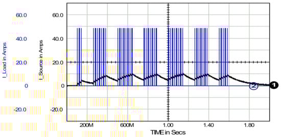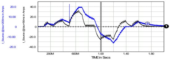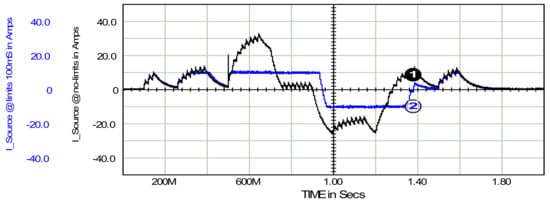 Figure 5 shows source and load currents for a combination of constant load and PWM-controlled load, waveforms 1 and 2, respectively. The following parameters of the currents shown were obtained: source current for the time period 100 ms–1.8 s: 17.7 A rms and 10.9 A std-dev; and load current for the time period 100 ms–1.3 s: rms and std-dev 27.6 A and 19.54 A, respectively. The time constant τ was set to 50 ms. Similar to the case shown in Figure 4, these data confirm the reduction of the source loading due to the SAPF compensation for the non-active component of the load current, see (8).