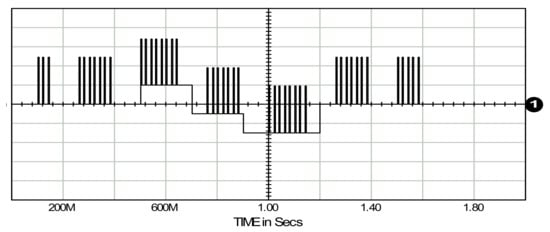 To compare various possibilities for achieving the desired source current or power quality, a reference load current waveform was adopted. It was chosen arbitrarily, but such that it would be “difficult” to compensate. Specifically, this waveform contains a constant load component and a PWM-controlled load component. An active component was also considered, where a load component within the SAPF compensation loop switches to generator mode. This reference waveform is shown in Figure 6.