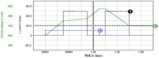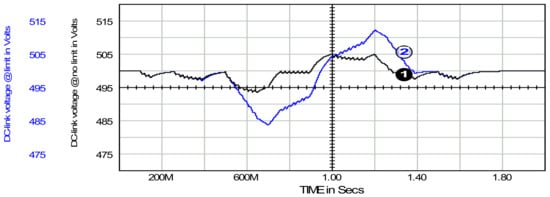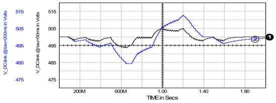 DC-link capacitor voltage at τ = 50 ms, waveform 1; and τ = 200 ms, waveform 2, respectively.