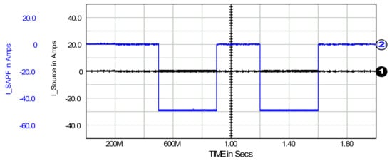 Figure 13 shows the SAPF current and the source current. The SAPF current here is not a compensating current in the usual sense. If the classical compensation method were applied, the SAPF current would be the non-active component of the load current. However, in the present case, its average value, i.e., the DC component, is equal to the active current of the load, thereby delivering the entire active power to the load. This active power is drawn from the DC-link capacitor, which is supplied from the higher voltage side–time interval 200 ms–1100 ms, waveform 2. Consequently, the source current on the lower voltage side is zero (neglecting the pulse current resulting from the hysteresis control of the VSI converter switches within the SAPF).