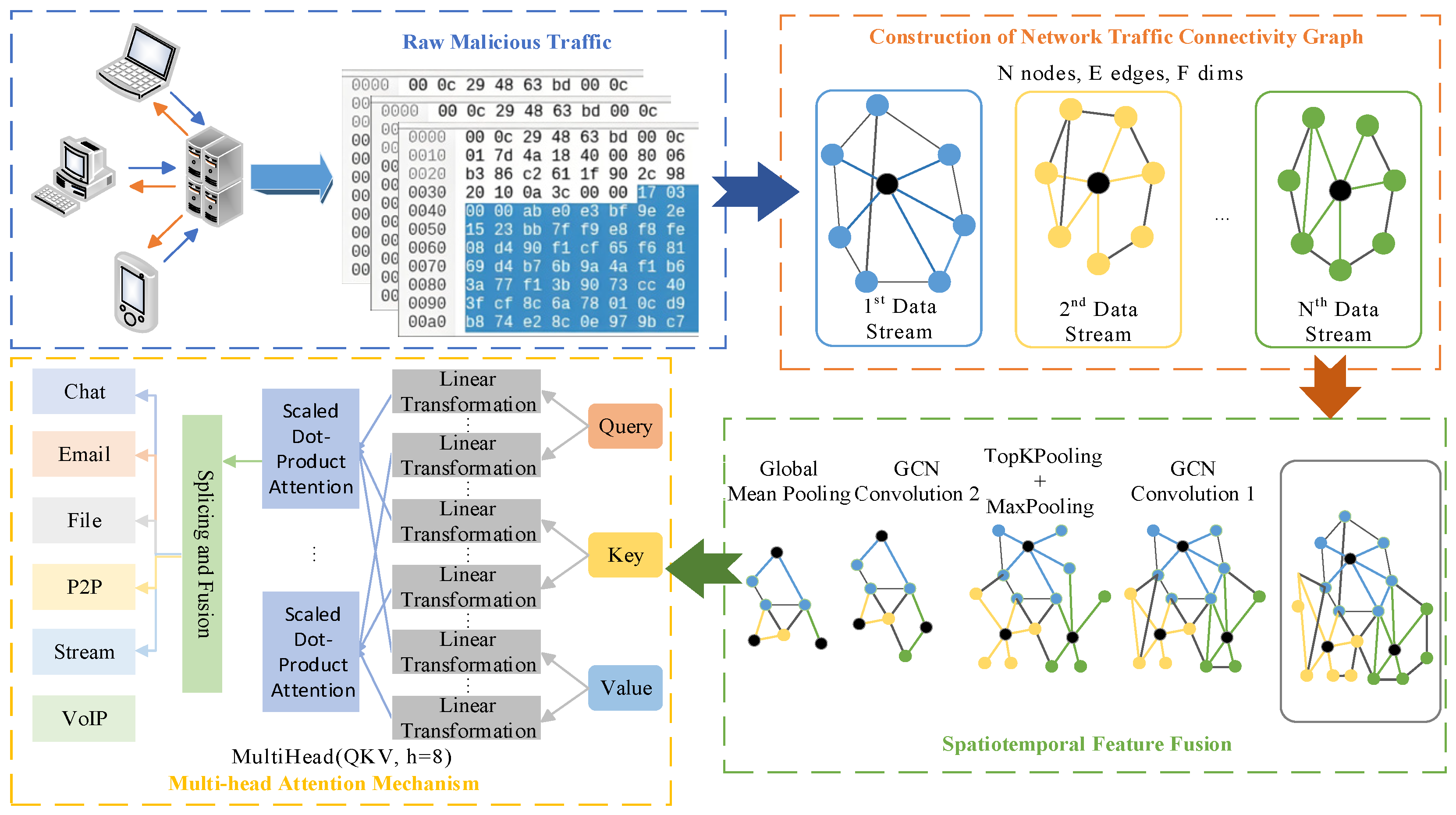 Chicago/Turabian StyleLiu, Yanan, Suhao Wang, Zheng Zhang, Tianhao Hou, Jipeng Shen, Pengfei Wang, Shuo Qiu, and Lejun Ma. 2025. "GCN-MHA Method for Encrypted Malicious Traffic Detection and Classification" Electronics 14, no. 23: 4627. https://doi.org/10.3390/electronics14234627