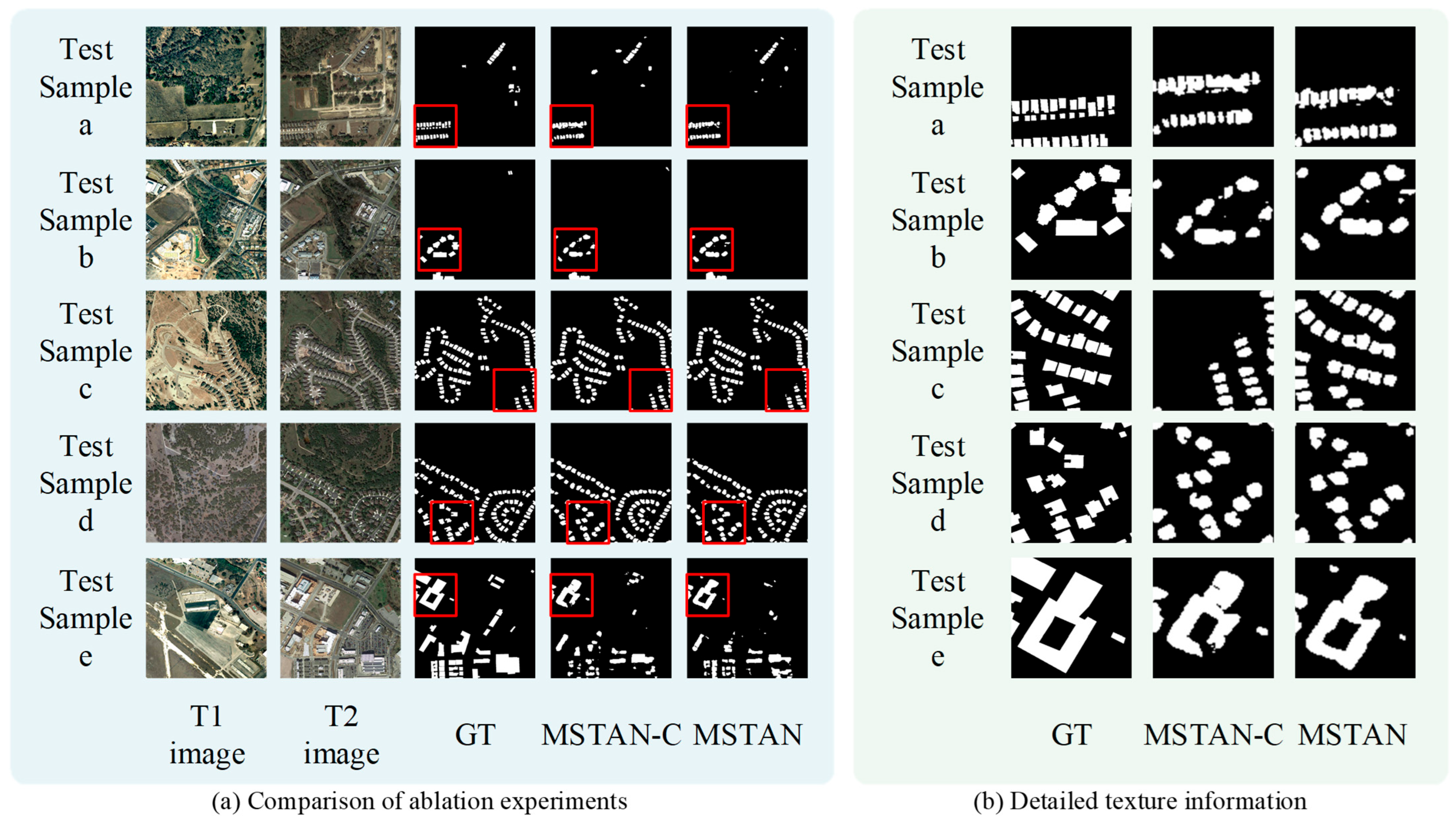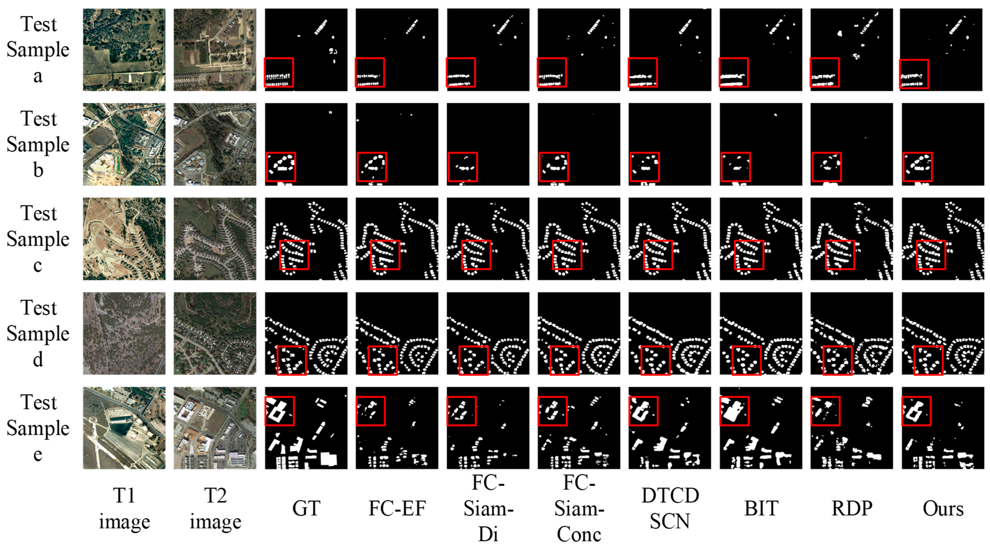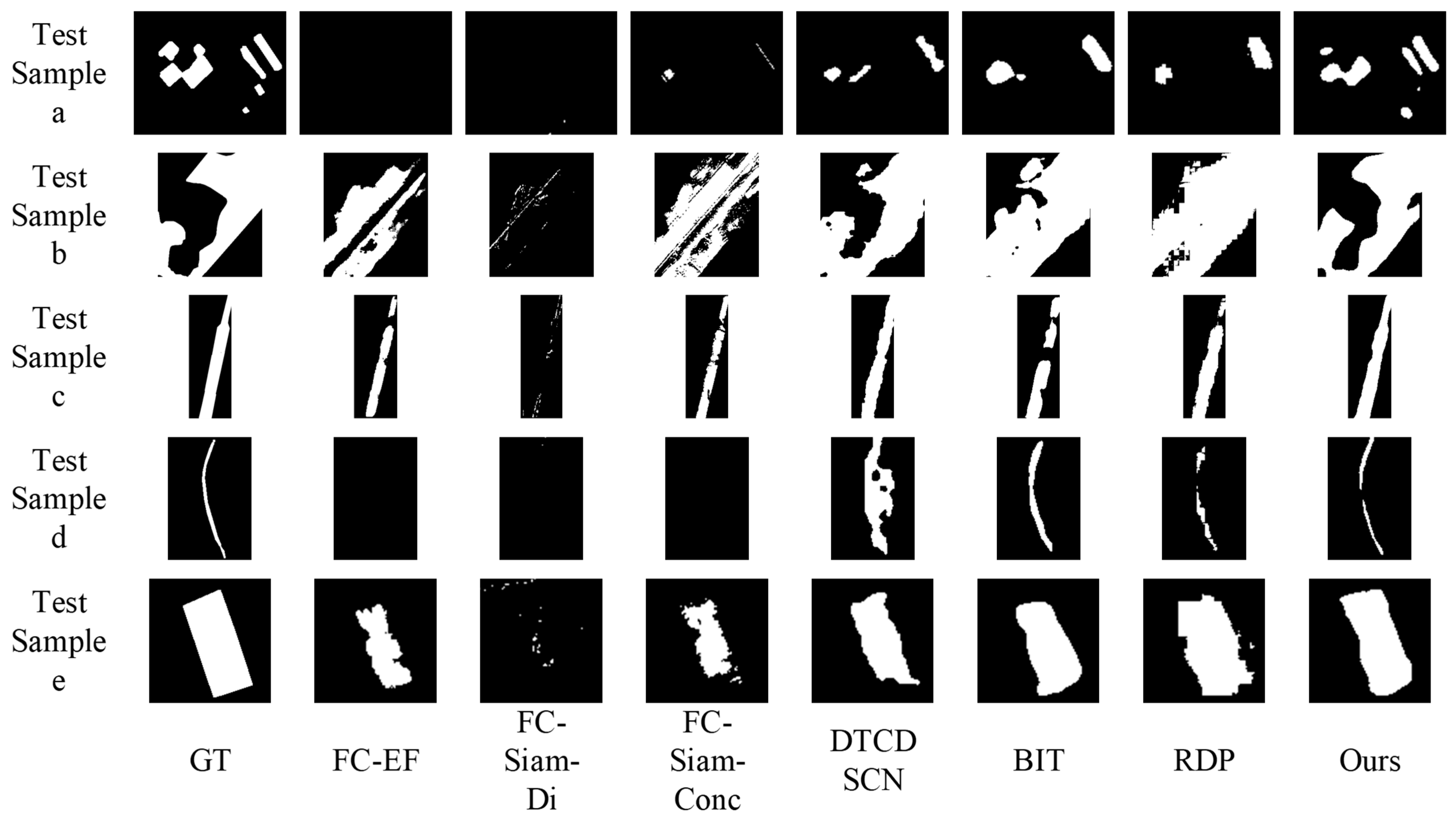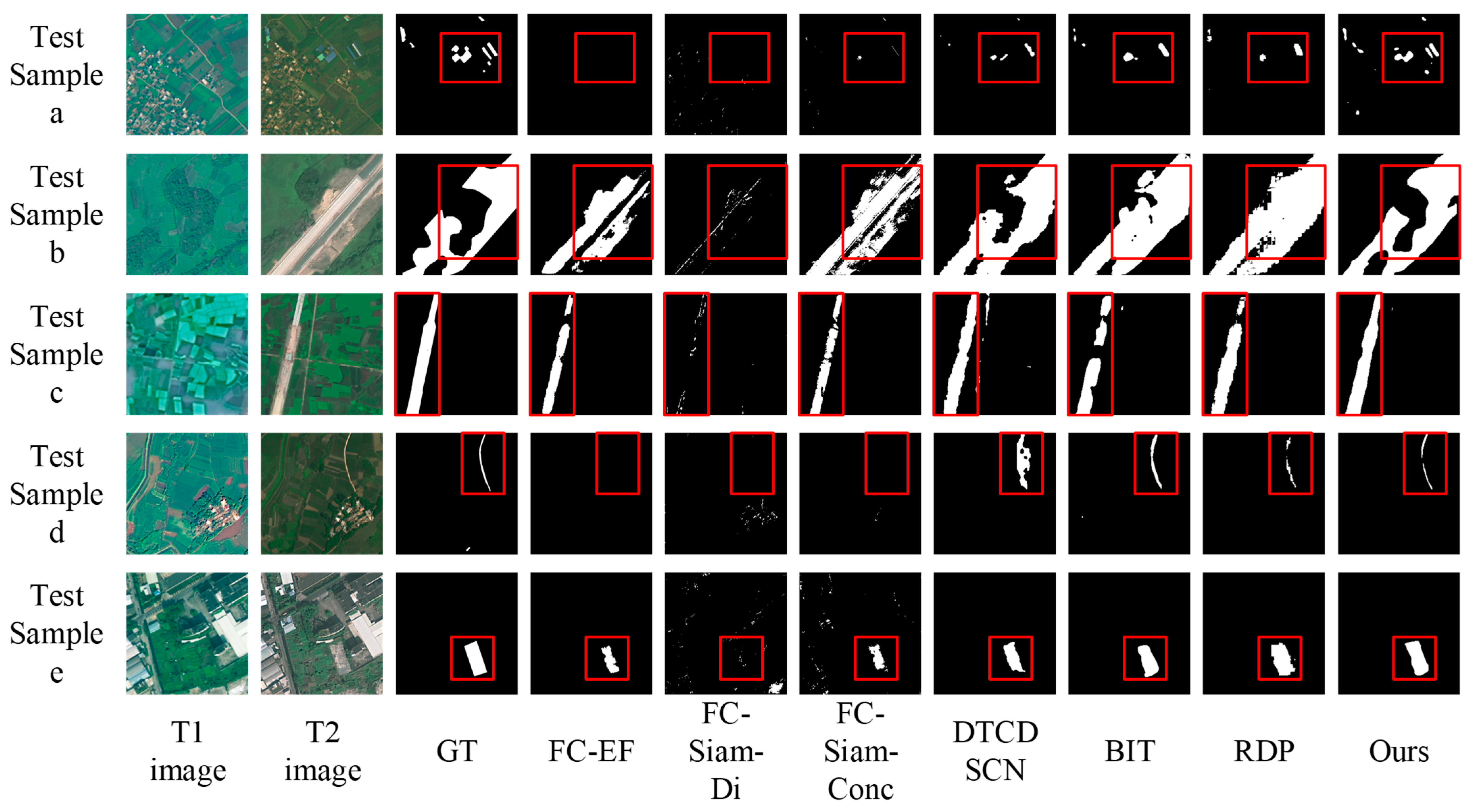 Figure 6. The FC-EF, FC-Siam-Di, and FC-Siam-Conc models exhibit a significant drop in precision and a notable increase in missed detections (e.g., test samples a, d, and e). The RDP, BIT, and DTCDSCN models suffer from severe false and missed detections. In contrast, MSTAN shows a marked improvement in reducing missed detections (e.g., test samples b and c), which corresponds to its higher Recall value. However, it also causes some missed detections (e.g., test samples e), which corresponds to its lower Precision value.