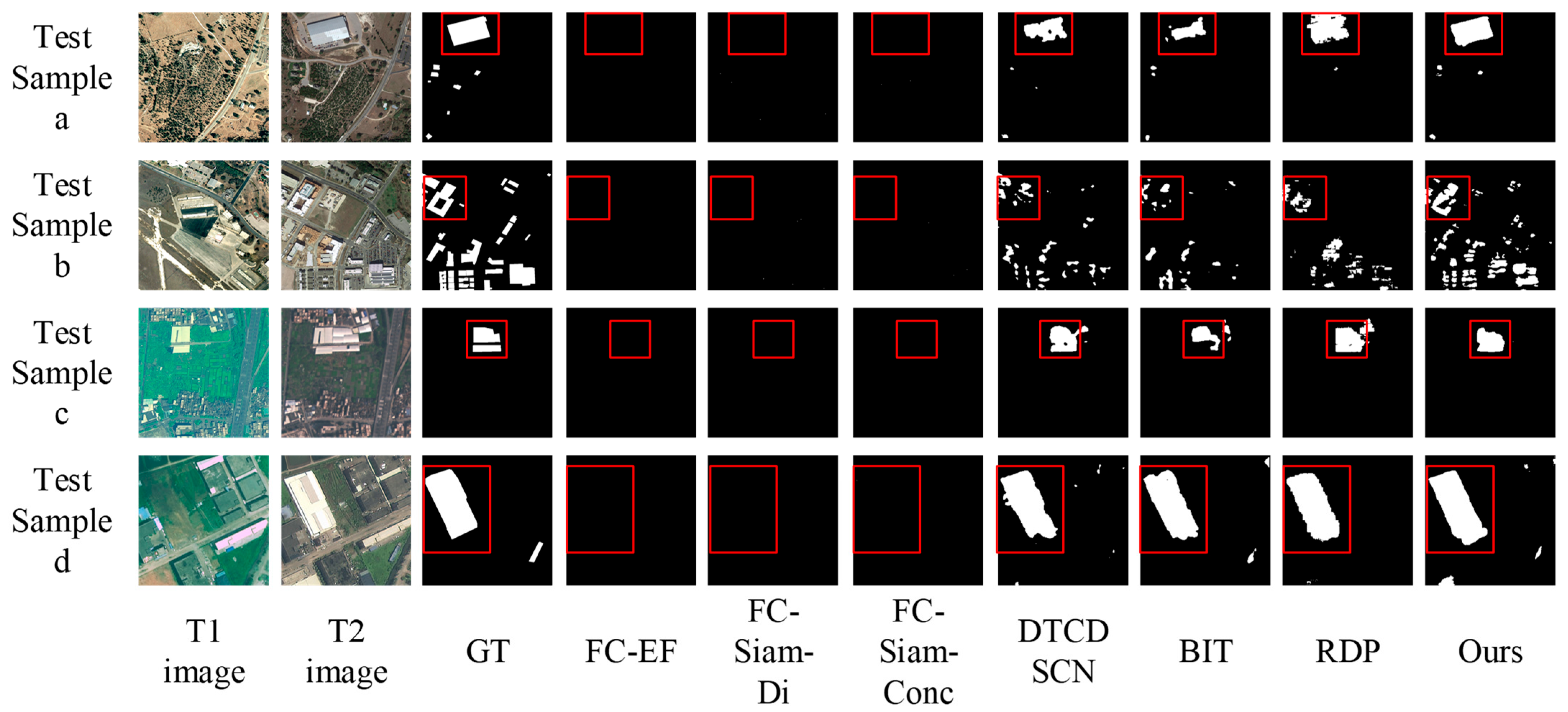 As shown in the figure, the FC-EF, FC-Siam-Di, and FC-Siam-Conc models performed poorly overall, detecting almost no regions of change. This represents a significant deviation from single-dataset test results, indicating weak cross-dataset generalization capabilities. The RDP model exhibits numerous false-positive regions (e.g., test samples a, c), corroborating its low Precision metric in