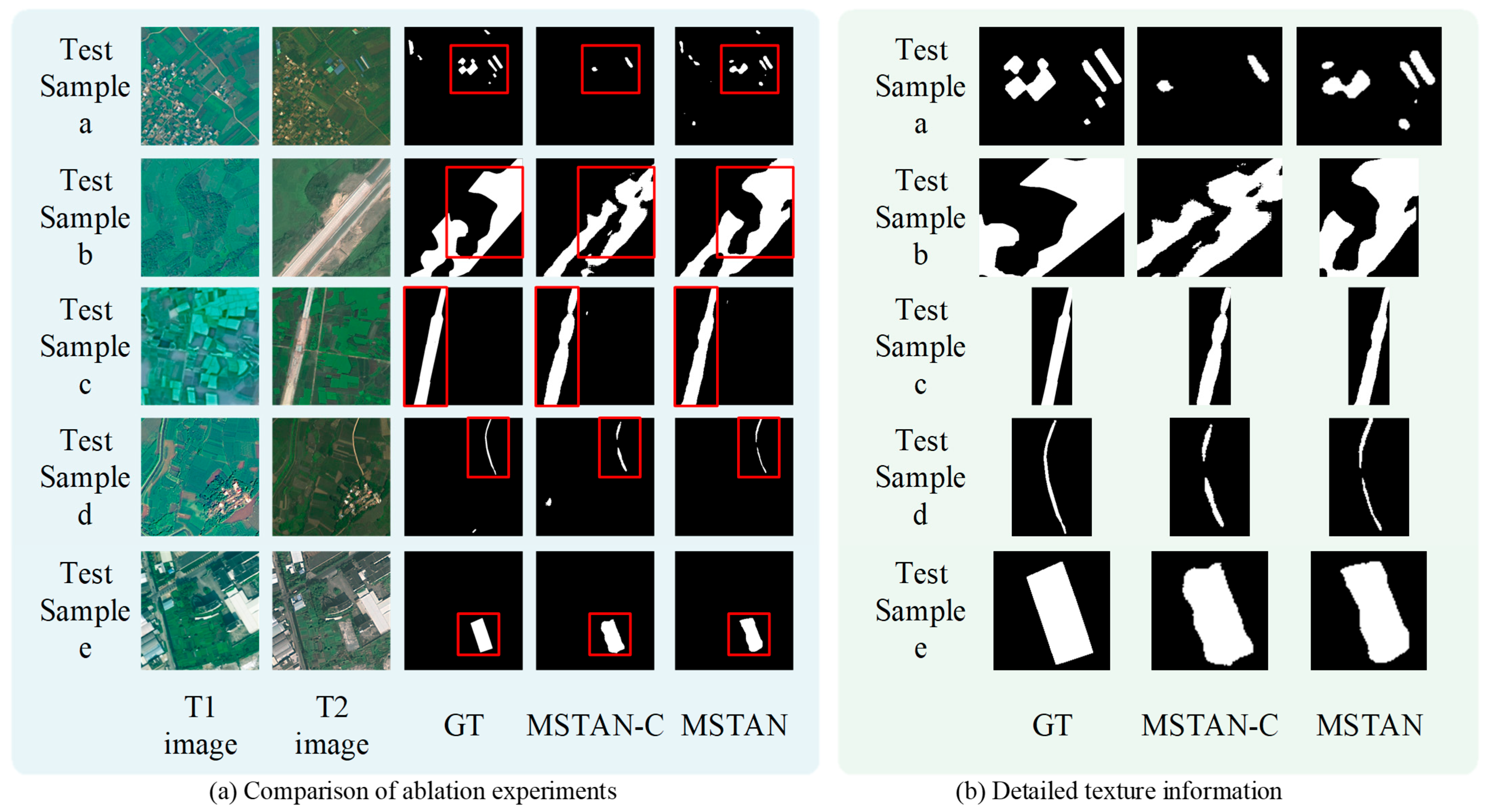 The improvement of MSTAN on the LEVIR-CD dataset is not particularly pronounced. The result generated by MSTAN-C exhibits irregular edges in the red-boxed region (e.g., test sample e), whereas the change region produced by MSTAN shows higher shape fidelity to the ground truth, with smoother and more accurate boundaries. This observation corresponds to the improvements in the IoU and F1-score metrics of MSTAN on the LEVIR-CD dataset in the quantitative analysis, indicating that the four-layer ASFF module enables more precise reconstruction of the morphology of changed regions and enhances the intersection-over-union ratio. The performance improvement of MSTAN is more significant on the CLCD dataset. The region detected by MSTAN-C not only deviates in shape but also contains several missed detections (e.g., test sample a). The detected edges are less smooth and continuous (e.g., test sample a). In contrast, MSTAN’s detection results are closer to the ground truth, with reduced noise. In test sample d, the ground truth contains a thin, elongated change line. MSTAN-C fails to detect this line continuously, exhibiting fragmentation, while MSTAN, although not fully capturing the entire line, handles the edge details more effectively.