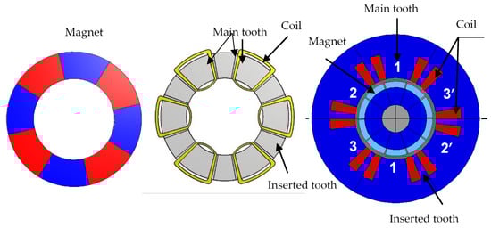 Here, rdid is defined as the proportion of the angular width of the inserted tooth relative to the principal tooth; α represents the ratio between the angular widths of a main tooth and a magnet; β indicates the ratio of the magnet’s angular width to the pole pitch; and p stands for the number of pole pairs.