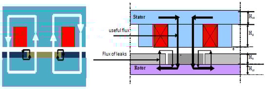 Figure 3 illustrates the division of the flux into useful and leakage components between the magnets. The use of Ampere’s law results in Equation (6) []: